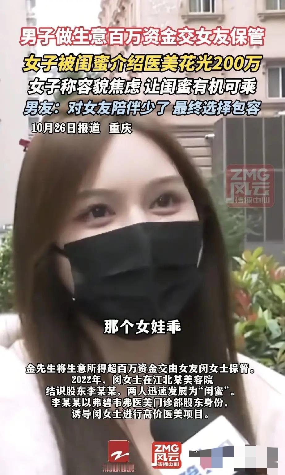 男子200万交给女友保管,生意急用钱时,女友一句话让他崩溃 “爱情来了,钱没了!” 男子在外拼命打拼,200多万收入全交女友保管,等生意周转要用钱,女友却直言一分没有。 “钱都花在脸上了啊。” 女友轻描淡写的一句话,让男子当场崩溃。他指着女友的脸,声音都在抖:“那可是200多万!你脸上能花这么多?” 女友却理直气壮:“你当初说要养我,让我安心变美,现在倒怪我花钱?” 男子又气又悔,当初信了“爱情至上”,没留任何凭证,如今叫天天不应。 朋友得知后都劝他维权,可想到曾经的甜蜜,他又犹豫。这事传开后,网友纷纷吐槽:“恋爱脑要不得,钱和信任都得留个心眼!” 最终男子还是决定走法律途径,只是心里的疙瘩,怕是难解开了。
