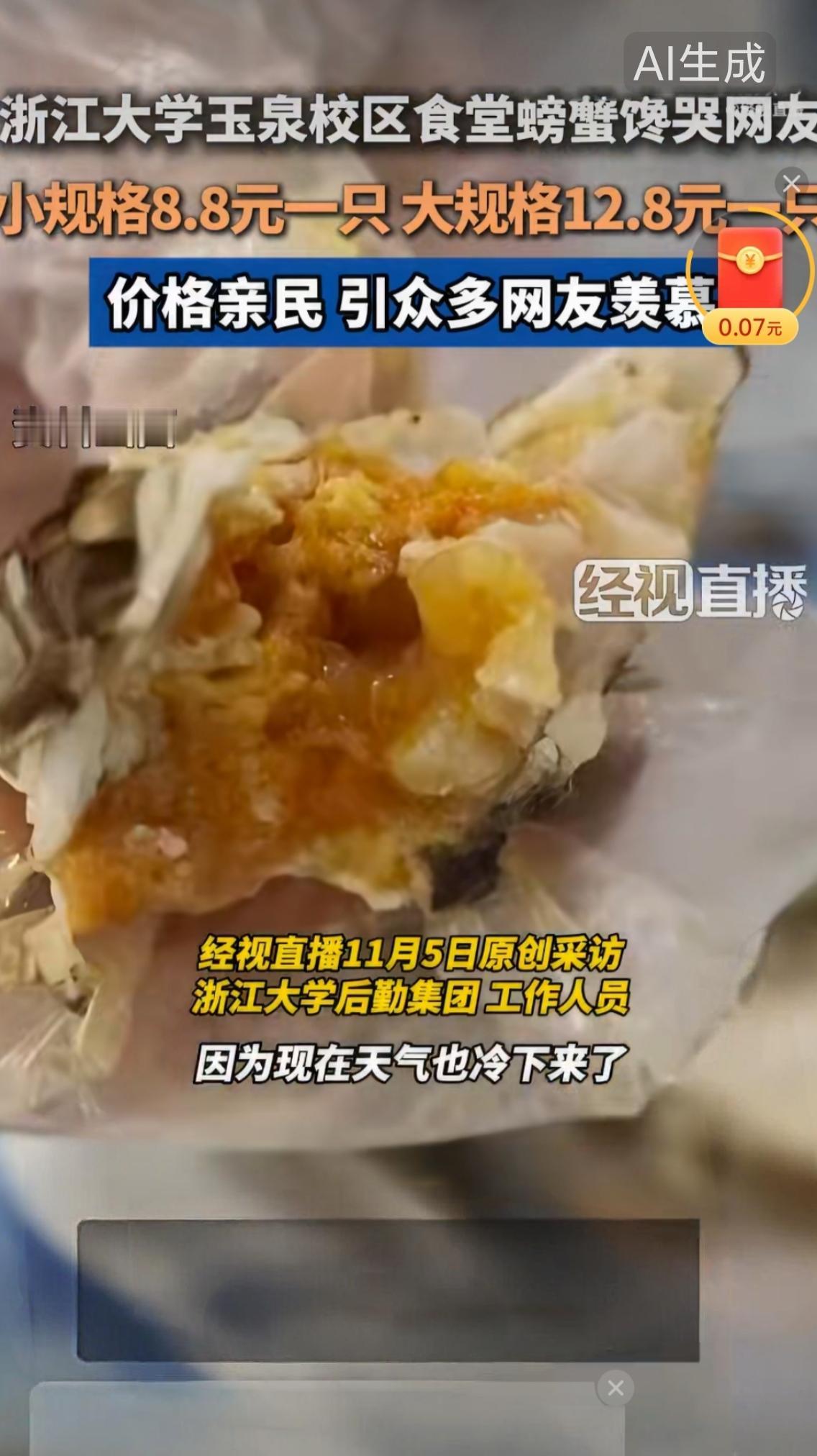 浙江大学食堂的螃蟹8.8元一只,想去考浙大还来得及吗 看到浙大的螃蟹这么便宜真是心动了,现在正是吃螃蟹的季节,学校为学生生活确实用心了。有的友友说看到都馋哭了,我看到想去浙大上学了。还是985/211好啊,不但学到尖端知识,而且还能享受便宜美食。这或许是人为啥往高处走的原因吧?
