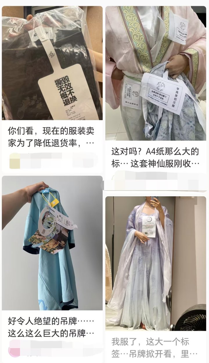 最近恰逢双十一,在社交平台上,有不少消费者吐槽收到的女装吊牌过大,有的比人脸还宽,材质坚硬到能当书写板。