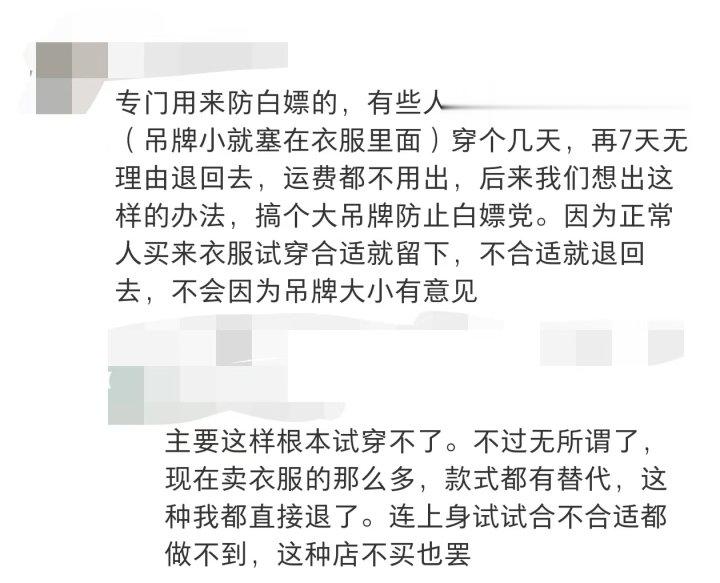 在商家看来,这是对政策被滥用的无奈反击。“七天无理由退货本是保护消费者的好政策,却被少数人当成‘零成本白穿7天衣服’的工具”,一位电商卖家的留言道出行业心声,而巨型吊牌不过是“实在扛不住后的下策”。