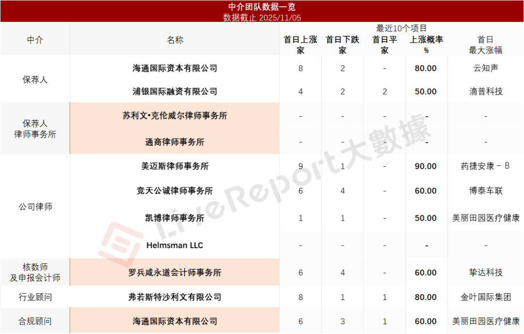 据LiveReport大数据统计,卓正医疗中介团队共计11家,其中保荐人2家,近10家保荐项目数据表现一般;公司律师共计4家,综合项目数据表现不足。整体而言中介团队历史数据表现有待改进。