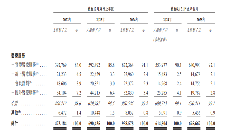 公司的收入主要来源于医疗服务,包括实体医疗服务、线上医疗服务、会员计划和院外医疗服务。2025年前八个月,实体医疗服务营收贡献达92.1%。