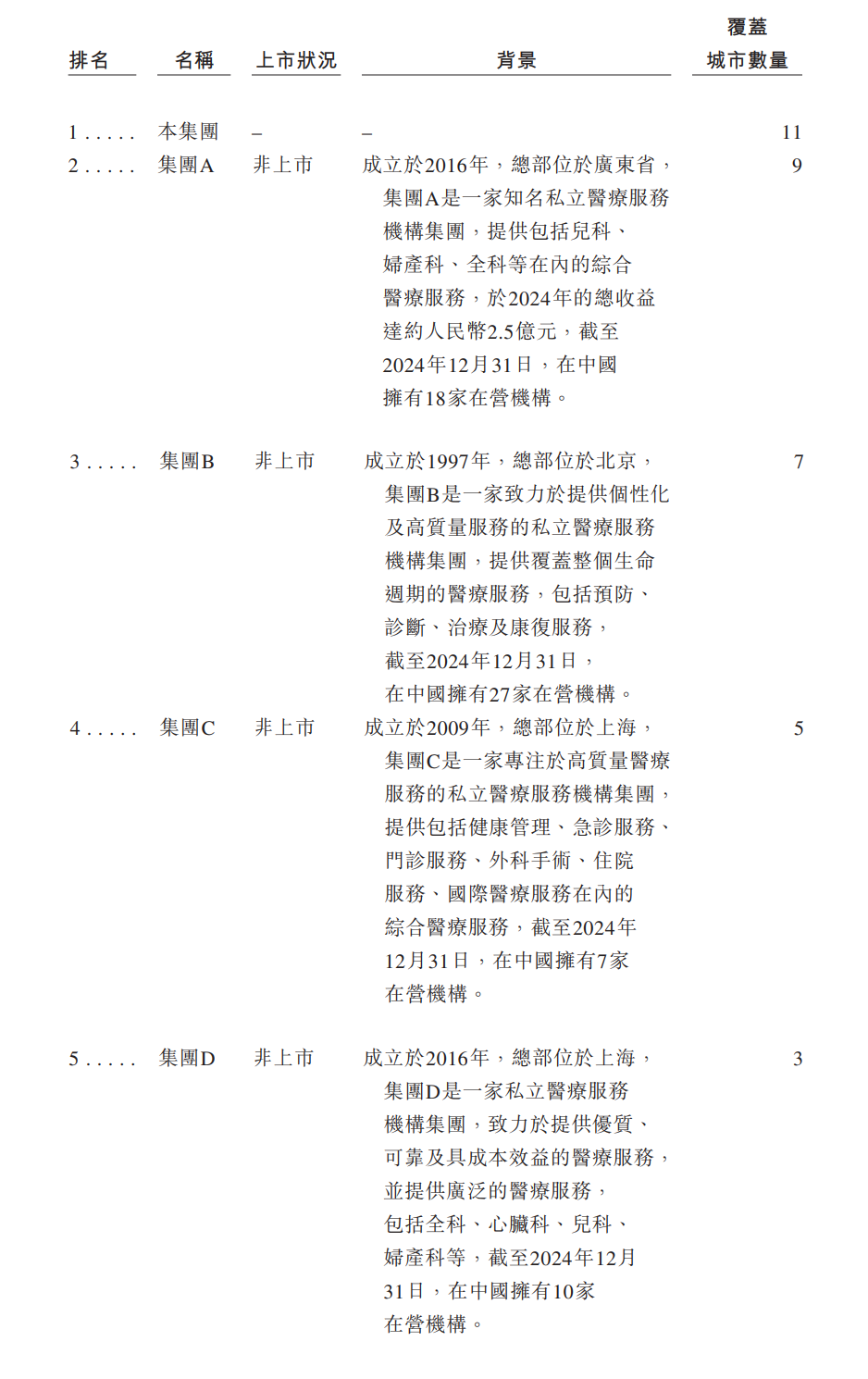 根据弗若斯特沙利文的资料,中国的私立中高端综合医疗服务市场高度分散,而按截至2024年12月31日所覆盖的中国城市数量及2024年的付费患者就诊人次计,公司在所有私立中高端综合医疗服务机构集团中分别排名第一及第二。