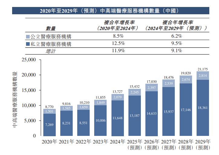 根据弗若斯特沙利文(Frost&Sullivan)的资料,2020年至2024年,私立中高端医疗服务机构数量快速增长,从2020年的7,269家增加至2024年的11,648家,复合年增长率为12.5%,预计从2024年至2029年将进一步以9.5%的复合年增长率增长,到2029年将达到18,361家。