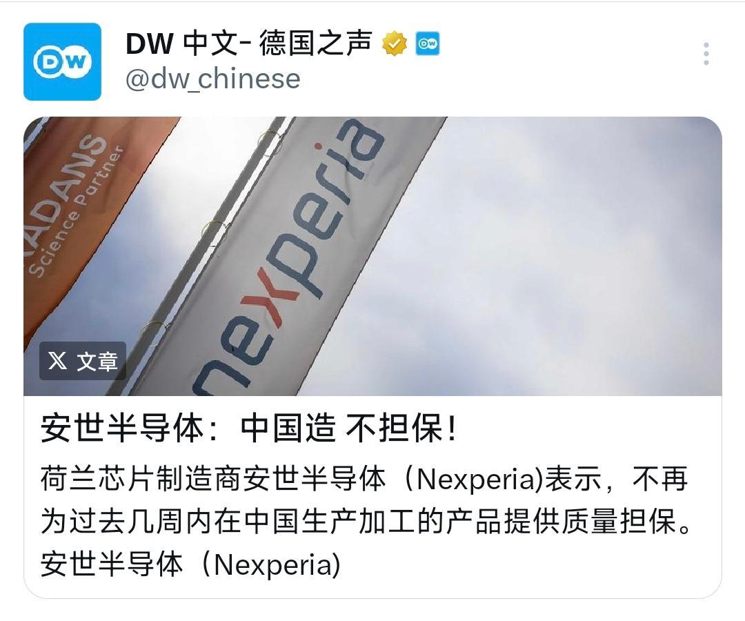 德国之声今晚(11月6日晚)报道:“荷兰芯片制造商安世半导体表示,不再为过去几周内在中国生产加工的产品提供质量担保。 安世半导体荷兰方面周四(11月6日)宣布,不能再保证在10月13日之后在中国进行进一步加工的半导体是正品,并且符合质量要求。同时,安世半导体表示对解决这场危机持乐观态度。” [机智]评几句:谁要你的保证呢?安世半导体中国完全有能力、有实力为顾客提供高质量且安全可靠的产品,根本无需你荷兰方面来指手画脚、空口保证。其突然宣布不再为在中国生产加工产品担保,不过是无端生事。