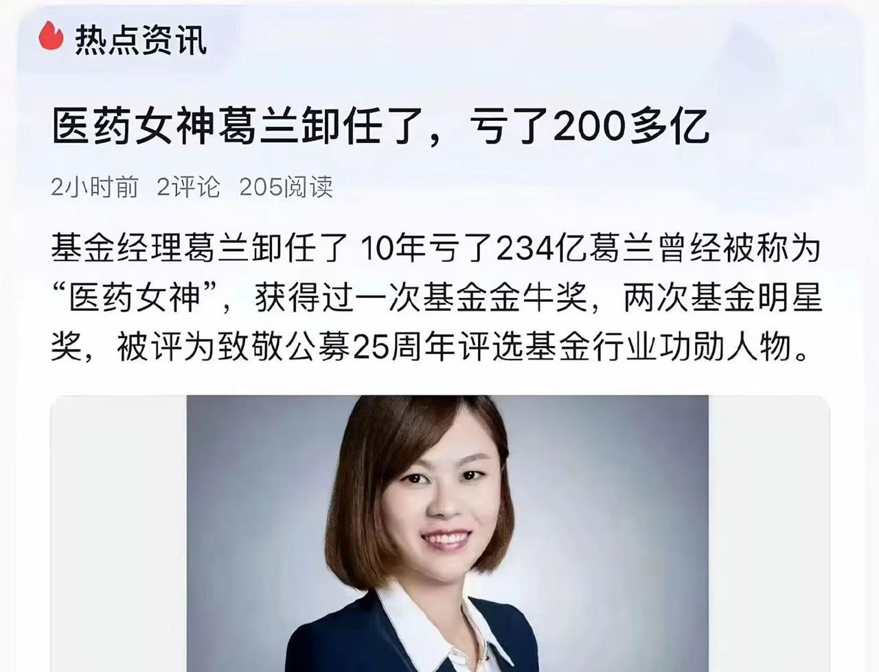 基金经理葛兰卸任了?10年亏了200多亿,曾被称为医药女神。 中欧基金的基金经