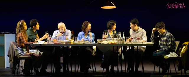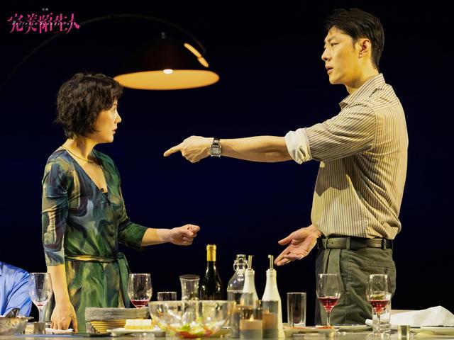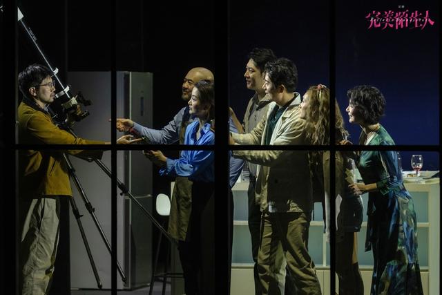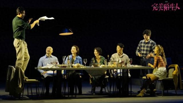话剧《完美陌生人》台词密集且节奏紧凑,演员完成大量对白,还需穿插一系列细致而琐碎的生活化动作,如切菜、备餐、吃饭等。七位演员几乎全程不曾离场,在舞台上呈现自然流淌的真实生活图景。舞台上两块大屏,时而透明,时而折射出镜面效果,让餐厅、客厅、厨房、阳台、卫生间这几个空间同时呈现在舞台上。