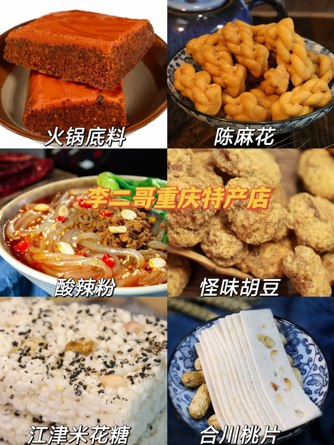 特产:火锅底料、陈麻花、怪味胡豆、酸辣粉、米花糖、合川桃片…