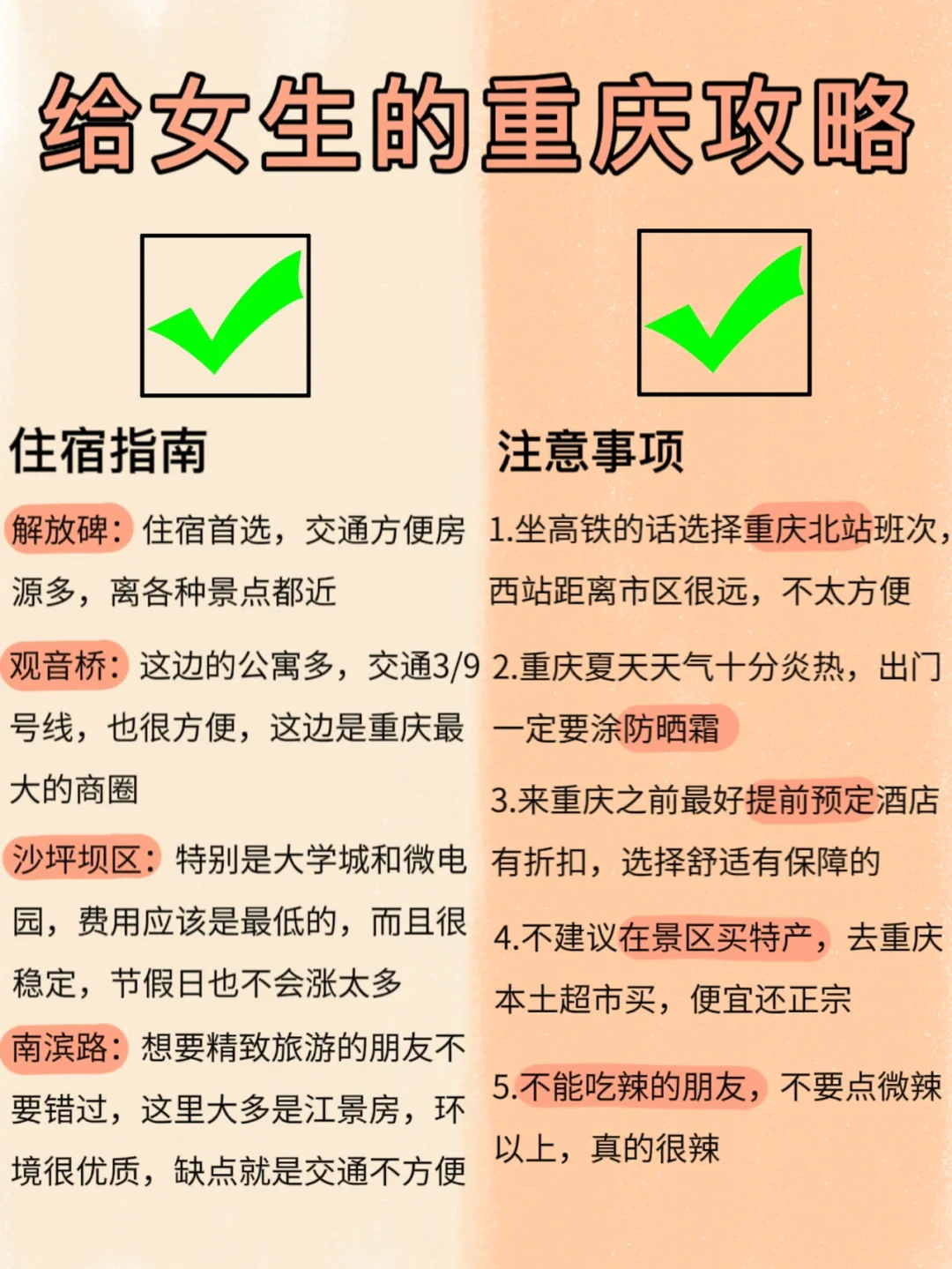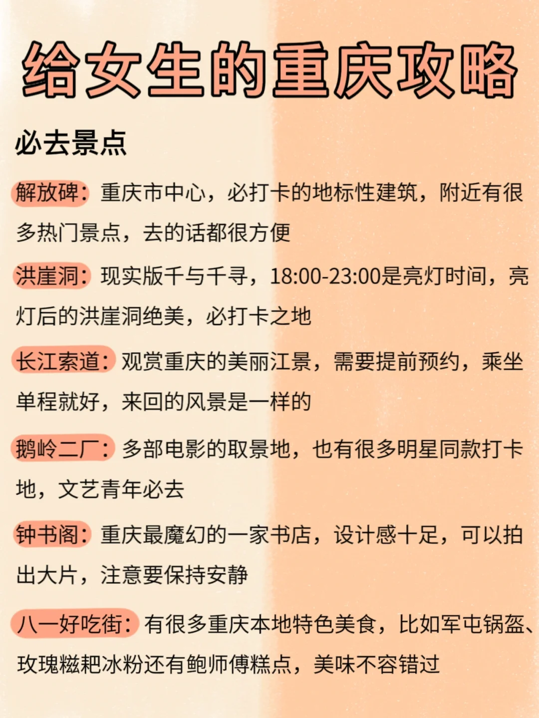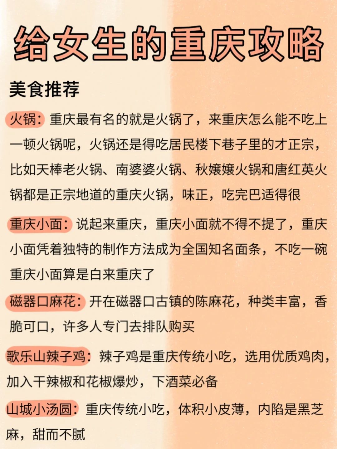 给想去重庆的女孩子们一份重庆旅游攻略,各种事项都已经整理好了✍🏻,要来重庆的女孩子们赶紧🐴住!希望大家都能在重庆玩得开心~