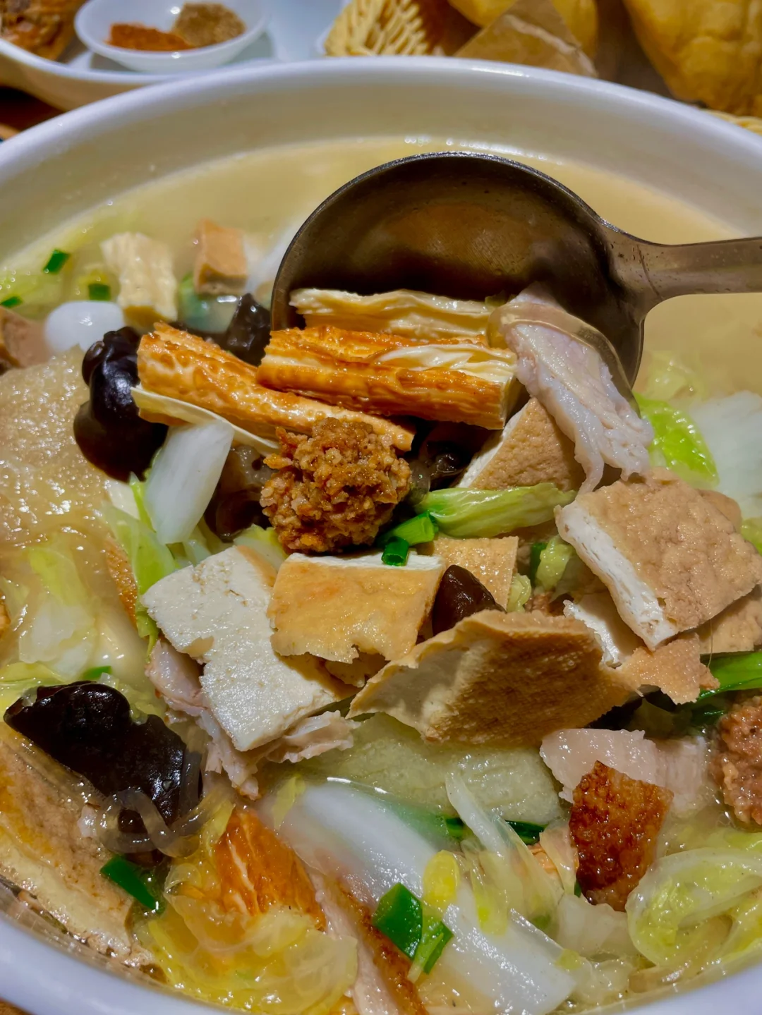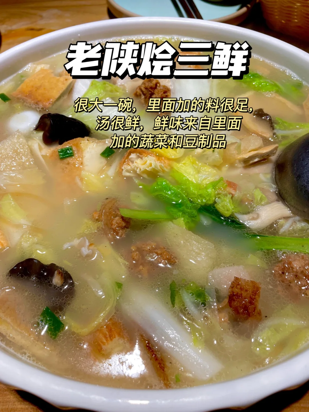 ✅老陕烩三鲜:汤都被我门喝完了,足以见汤有多鲜,有白菜、鹌鹑蛋、肉丸子、豆皮、豆腐等等,营养很丰富,肉丸子应该是先炸过再入汤的,不一样的味道