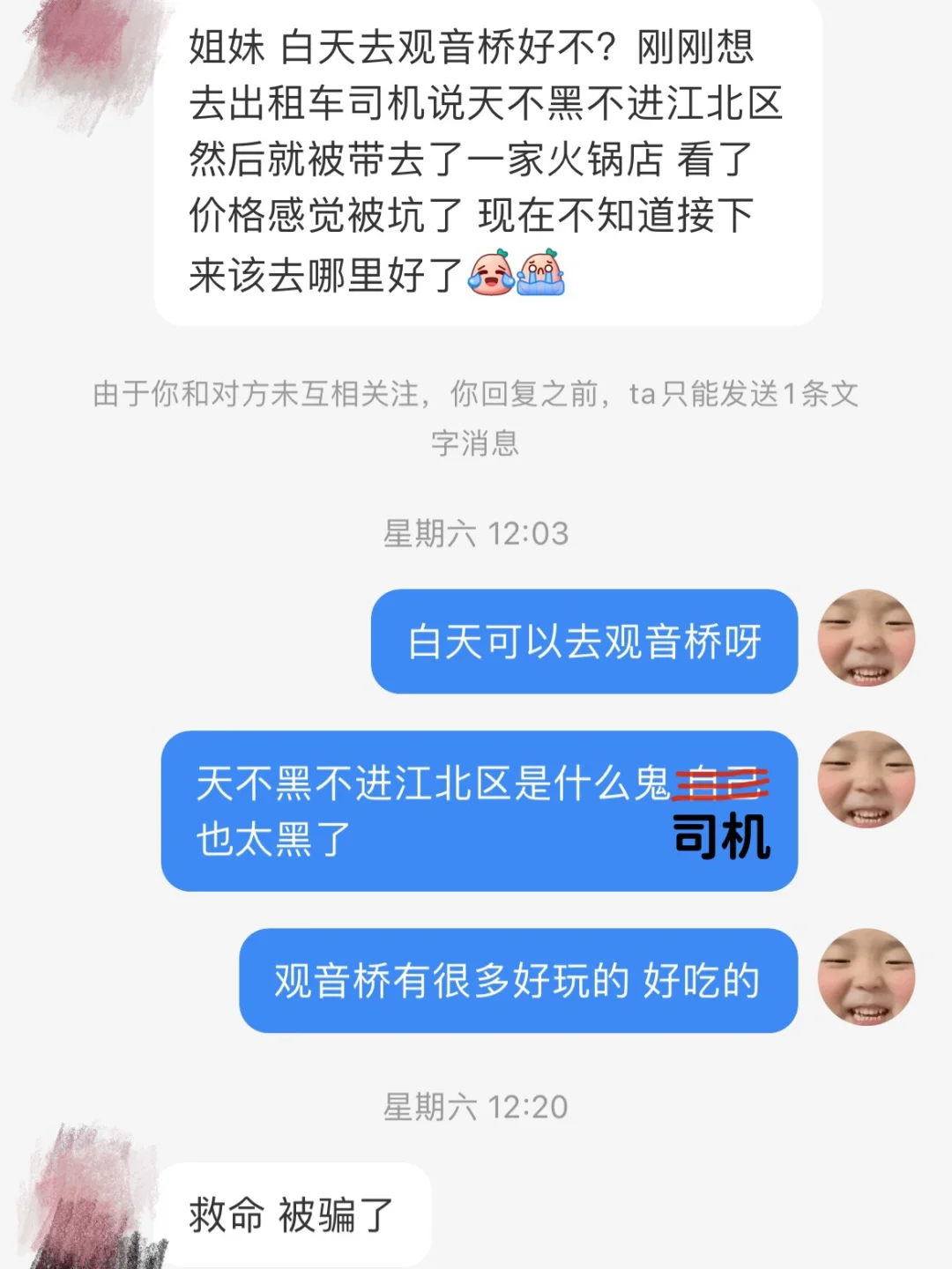 有uu投稿,她来重庆结果被出租车司机忽悠观音桥白天不能去,我就真的对这个司机纯纯无语‼️集美呀,出来旅游请一定要做好攻略