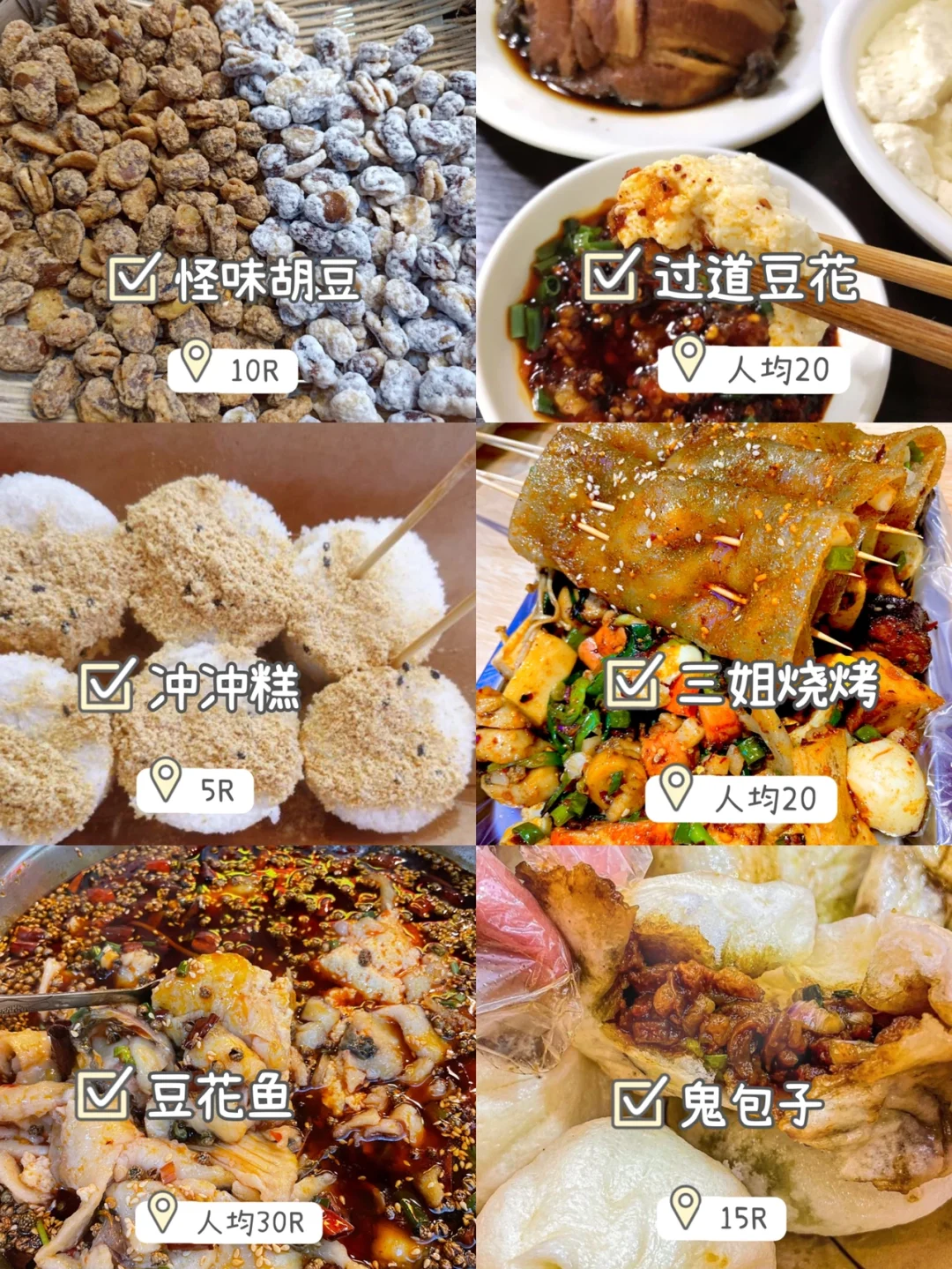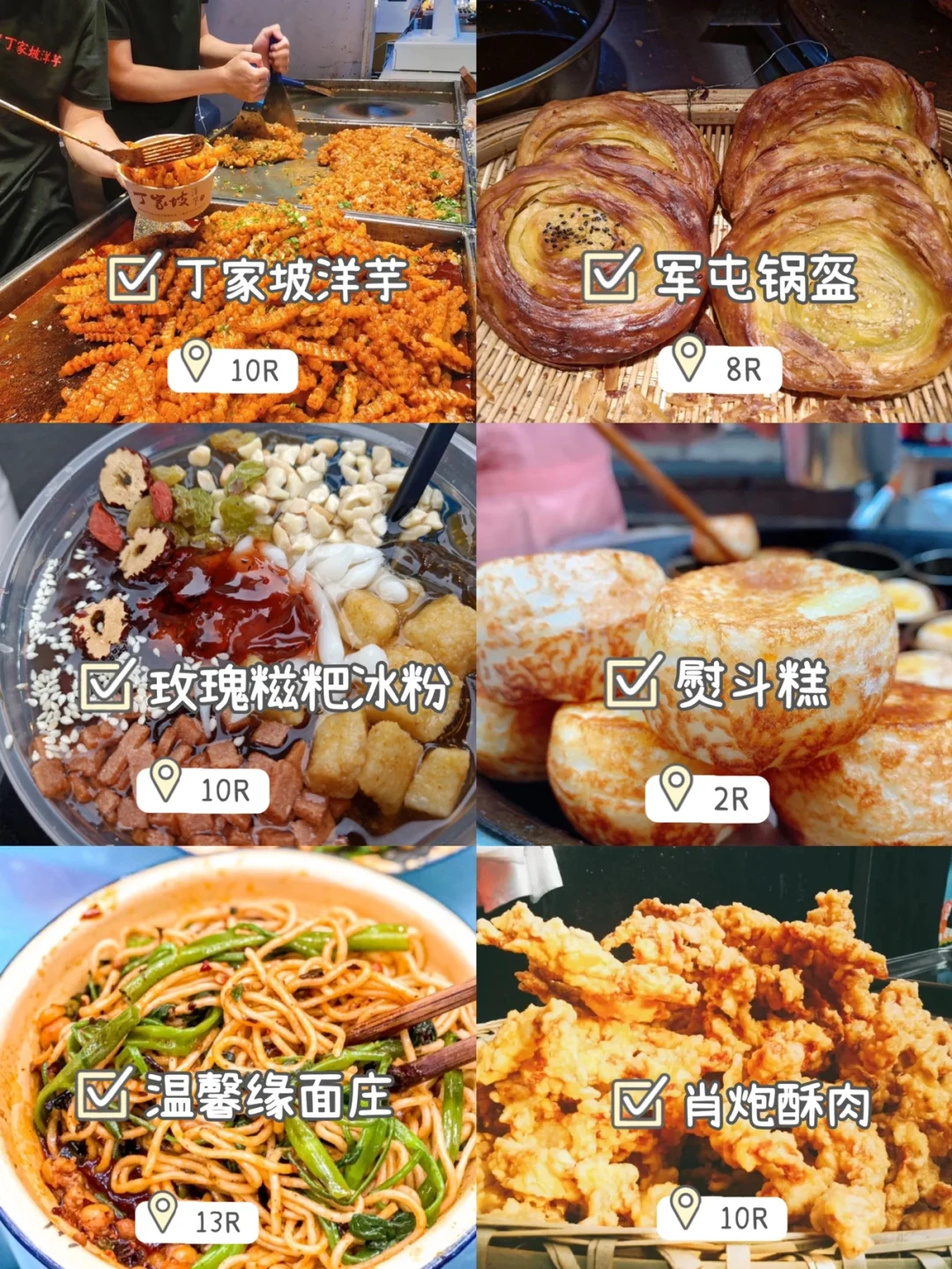 车轮饼、蛋烘糕、九九牛肉馆、六指烧烤、怀粮生煎、锅巴土豆、蛋包洋芋、唐红英火锅、秋孃孃火锅、南婆婆火锅
