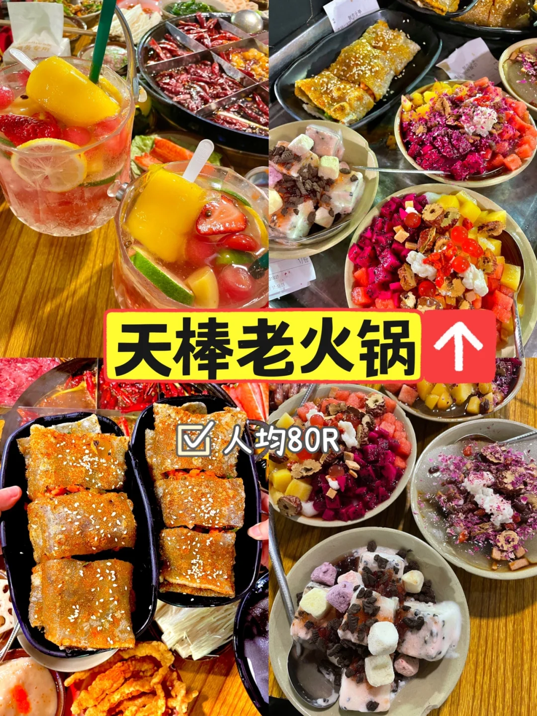 唯一一家吃过两次的店(给我留下深刻印象的还是它家的炒饭和烤苕皮)能吃出来是重庆的老火锅味道,底料端上来就开始闻到香味了,不能吃辣的朋友记得点微辣🌶️,因为中辣的辣度都很辣了,吃完后再点一杯“天棒特饮”🍹,里面有冰糕、西瓜、百香果等,吃起来很解辣