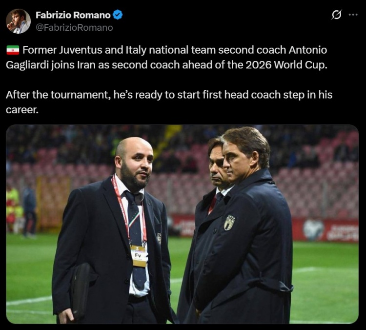 直播吧11月8日讯罗马诺报道,前尤文、意大利国家队助理教练加利亚尔迪(上图图左)加入伊朗国家队教练组,担任助理教练,备战2026年世界杯。