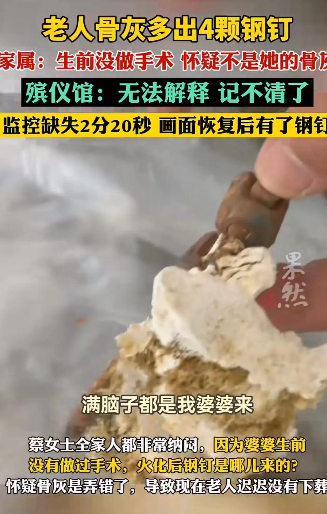 河南新乡,婆婆火化后,骨灰却莫名其妙多出4颗钢钉!儿媳:“我婆婆生前没做过手术,怀疑不是她的骨灰!我们没法给她下葬,没法跟我公公合葬呀,我公公旁边躺的是谁,都不知道!”可是查监控却发现缺失超2分钟…… 河南新乡,这个曾经平凡的小城,突然被一桩诡异的事件点燃了舆论的火焰。婆婆火化后,骨灰中竟然莫名其妙多出4颗钢钉!这到底是巧合,还是隐藏着不为人知的秘密?儿媳的疑问像一把利刃,直指人心:“我婆婆生前从未做过手术,骨灰中出现的钢钉,让我们怀疑这不是她的骨灰。”这句话背后,是一份无法言喻的迷惑,也是一段扑朔迷离的阴影。 更令人震惊的是,儿媳说:“我们没法给她下葬,没法跟我公公合葬呀。”这句话仿佛揭开了一个更深层次的谜题:骨灰中到底藏着什么?是有人在暗中操作?还是有更深的隐情?而令人心惊的是,公公旁边躺着的“谁”,竟然无人知晓。这种荒诞的场景,让人不禁思考:在这个看似平静的家庭背后,隐藏着怎样的秘密?又有多少不可告人的故事被掩盖在尘埃之下? 然而,真相似乎并不简单。警方调查监控,却发现关键的超2分钟录像缺失——这是人为的失控,还是有人在暗中操控?这短短的两分钟,或许隐藏着破案的线索,也可能是事件的转折点。究竟是谁在背后操控?他们想掩盖什么?又为什么要如此隐秘?这场看似普通的家庭悲剧,逐渐变成一场扑朔迷离的悬疑剧。 这起事件引发了社会的广泛关注,也让人们开始反思:在快节奏的现代生活中,我们是否忽视了身边那些看似普通却隐藏着巨大秘密的家庭?我们是否真正了解自己家人的过去?又有多少事情,藏在日常的平凡背后,等待被揭开? 每一个细节都像是拼图的一块,而真相,似乎还在远方等待被发现。我们期待着警方早日揭开谜底,也希望每一个家庭都能多一份关爱和警觉。毕竟,生命的奥秘远比我们想象得复杂,也许下一次的真相,就藏在我们最熟悉的人和最平凡的瞬间里。读到这里,你是否也在思考:你身边的故事,又隐藏着怎样的秘密?骨灰钢钉