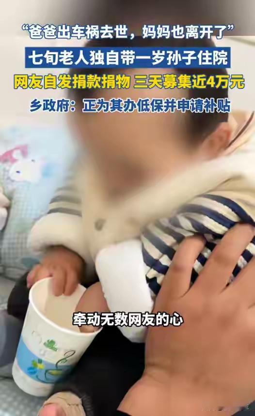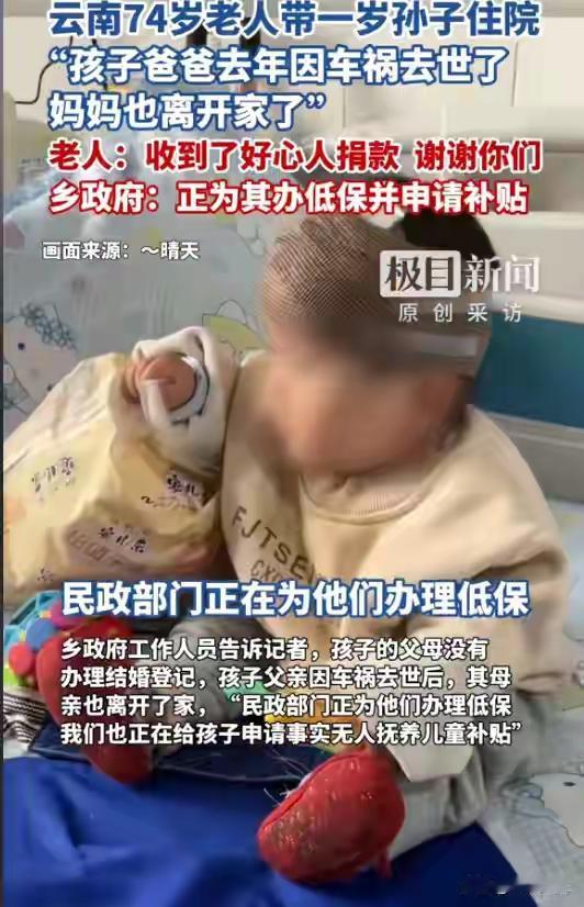 云南一位74岁的老人,带着1岁的孙子住院,小孩子两天还穿着同一件衣服。问了才知,孩子爸爸在孩子两个月的时候去世了,妈妈也离家再也没回来。临床的宝妈发到网上引来好心网友捐款。 网友评论: 这孩子也太可怜了 孩子的母亲心真狠,扔下就走了,这女人怎么忍心,孩子才岁。 人人都献出一点爱,这个世界会很温暖的,小小年纪实在不容易[祈祷][祈祷][祈祷] 好心人真的很多,希望可以帮助老人度过难关[祈祷][祈祷][祈祷] 现在乡镇才知道这家困难开始给办低保那之前呢不知到吗?要是不是好心人爆料低保会有吗? 来源:史书先生