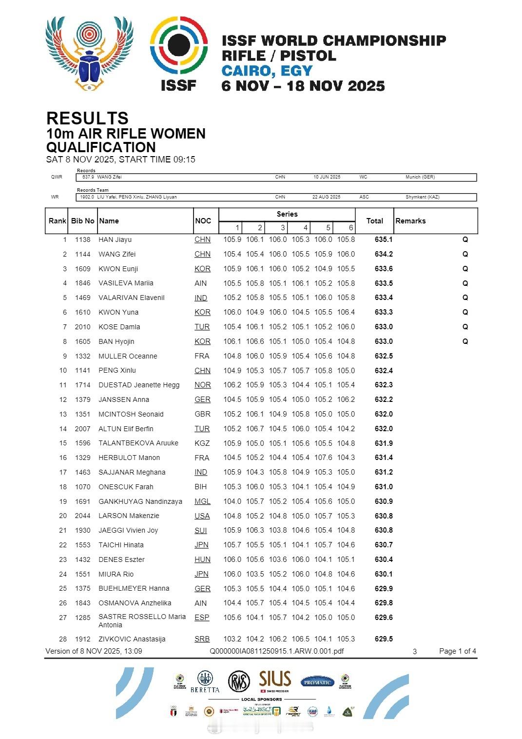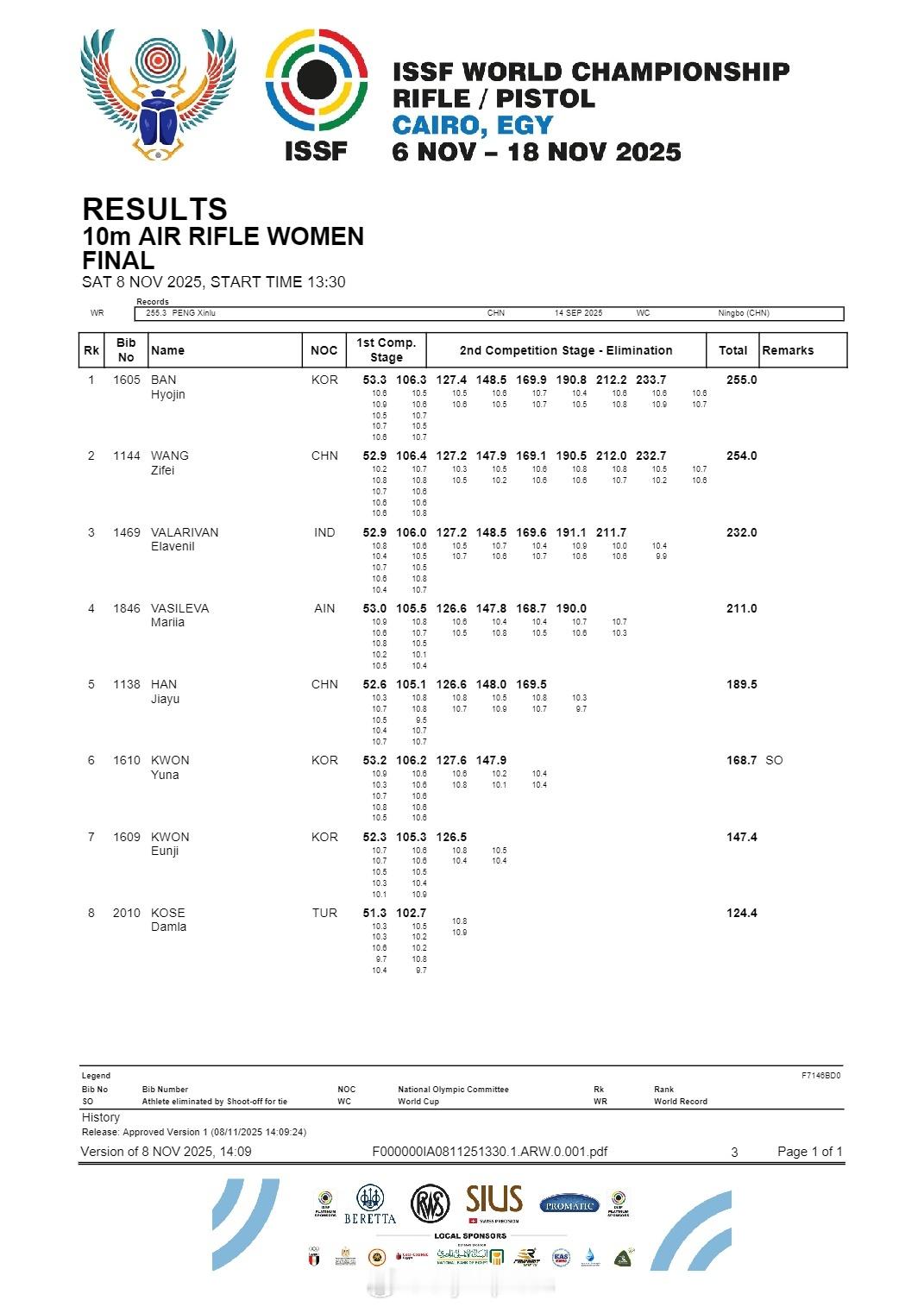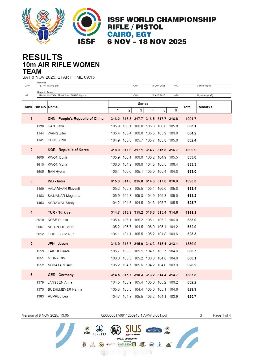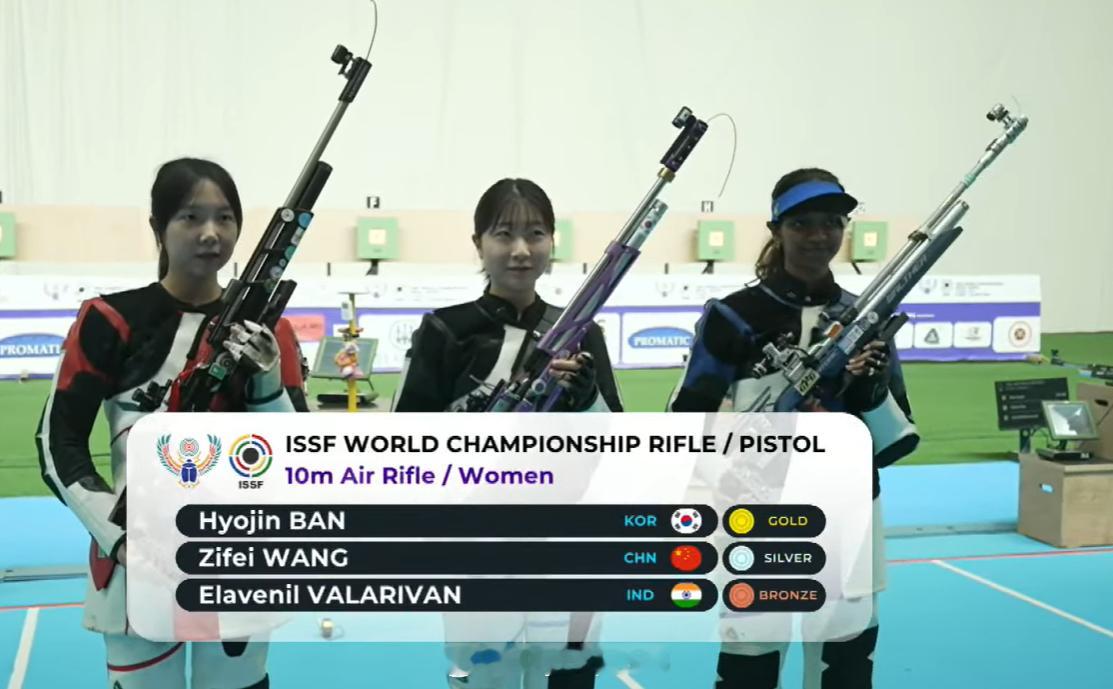 【射击世锦赛女子气步枪王子菲摘银 中国团体夺冠】国际体坛战报速递 11月8日埃及开罗,2025年射击(步手枪)世锦赛揭幕。在女子10米气步枪比赛中,韩国的巴黎奥运金牌得主潘孝真一路领先以255环夺得冠军。资格赛排名第二的中国小将王子菲落后一环摘得银牌,印度瓦拉里万获得铜牌。资格赛排名第一的韩佳予名列第五。世界纪录保持者彭鑫露资格赛第十无缘决赛。韩佳予、王子菲和彭鑫露还以1901.7环夺得团体冠军。