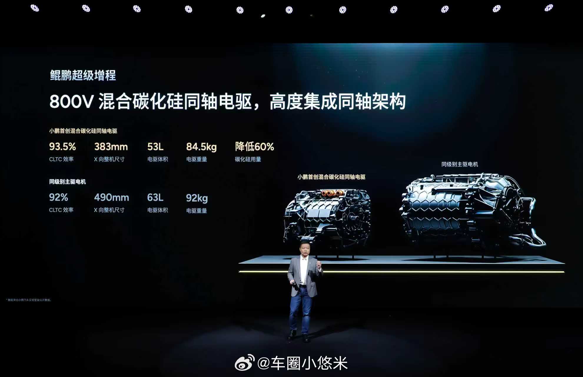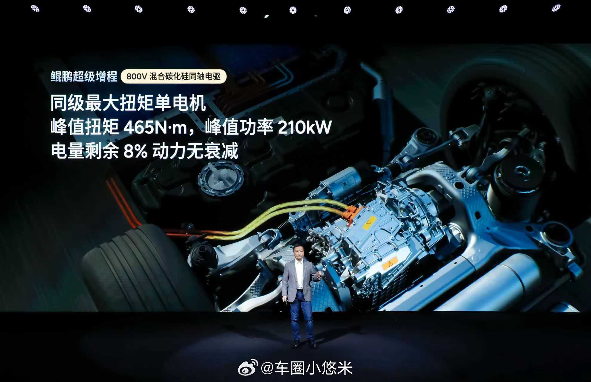 小鹏首创800V混合碳化硅同轴电驱,采用高度集成同轴架构,CLTC综合效率高达93.5%,兼具高集成与强动力,峰值扭矩达465N·m,峰值功率210kW,并实现电量剩余8%动力无衰减。