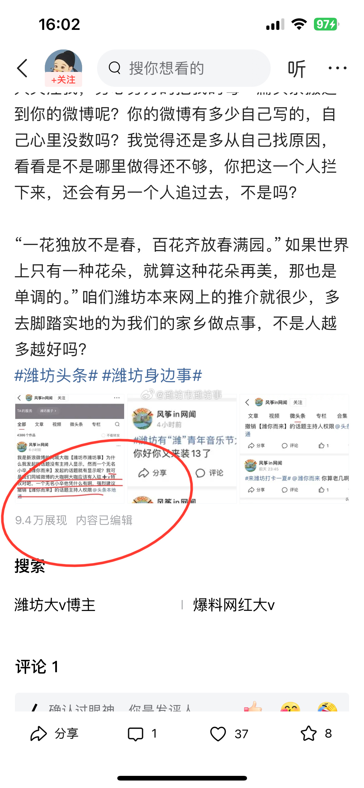 李总您好,今日头条自媒体账号【潍你而来】认证为优质本地领域创作者于2023年6月23日十六时三十九分发表一篇内容为【我和潍坊某网络大v不得不说的故事。谁能想到我一个无名小卒竟然能跟同城大咖产生近两年的爱恨情仇,有赢家吗?】9.4万展现,三条评论,36点赞,8个收藏,已经涉嫌违反最高人民法院 最高人民检察院关于办理利用信息网络实施诽谤等刑事案件适用法律若干问题的解释法释〔2013〕21号第二条 利用信息网络诽谤他人罪,本人的今日头条并无她群截图的内容,且本人多次勒令她删除该内容,反观她拒不配合,还恳请李总明查[作揖]