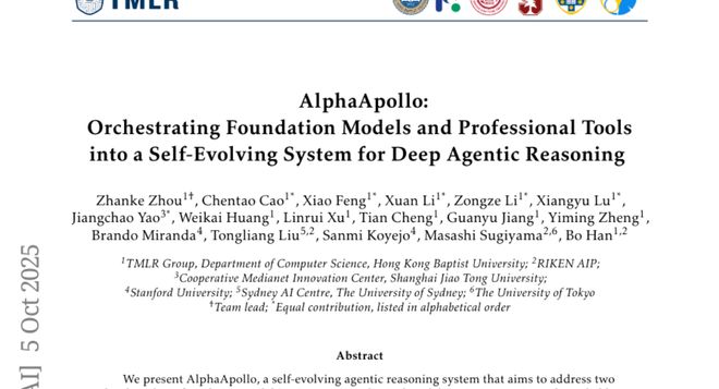 由香港浸会大学计算机科学系TMLR研究组的周展科领导的国际研究团队,联合RIKENAIP、上海交通大学、斯坦福大学、悉尼大学和东京大学的研究人员,于2025年10月发表了一项突破性研究。他们开发出名为AlphaApollo的智能推理系统,这篇题为"AlphaApollo:OrchestratingFoundationModelsandProfessionalToolsintoaSelf-EvolvingSystemforDeepAgenticReasoning"的论文已在arXiv平台发布(论文编号:arXiv:2510.06261v1),感兴趣的读者可以通过该编号查询完整研究内容。