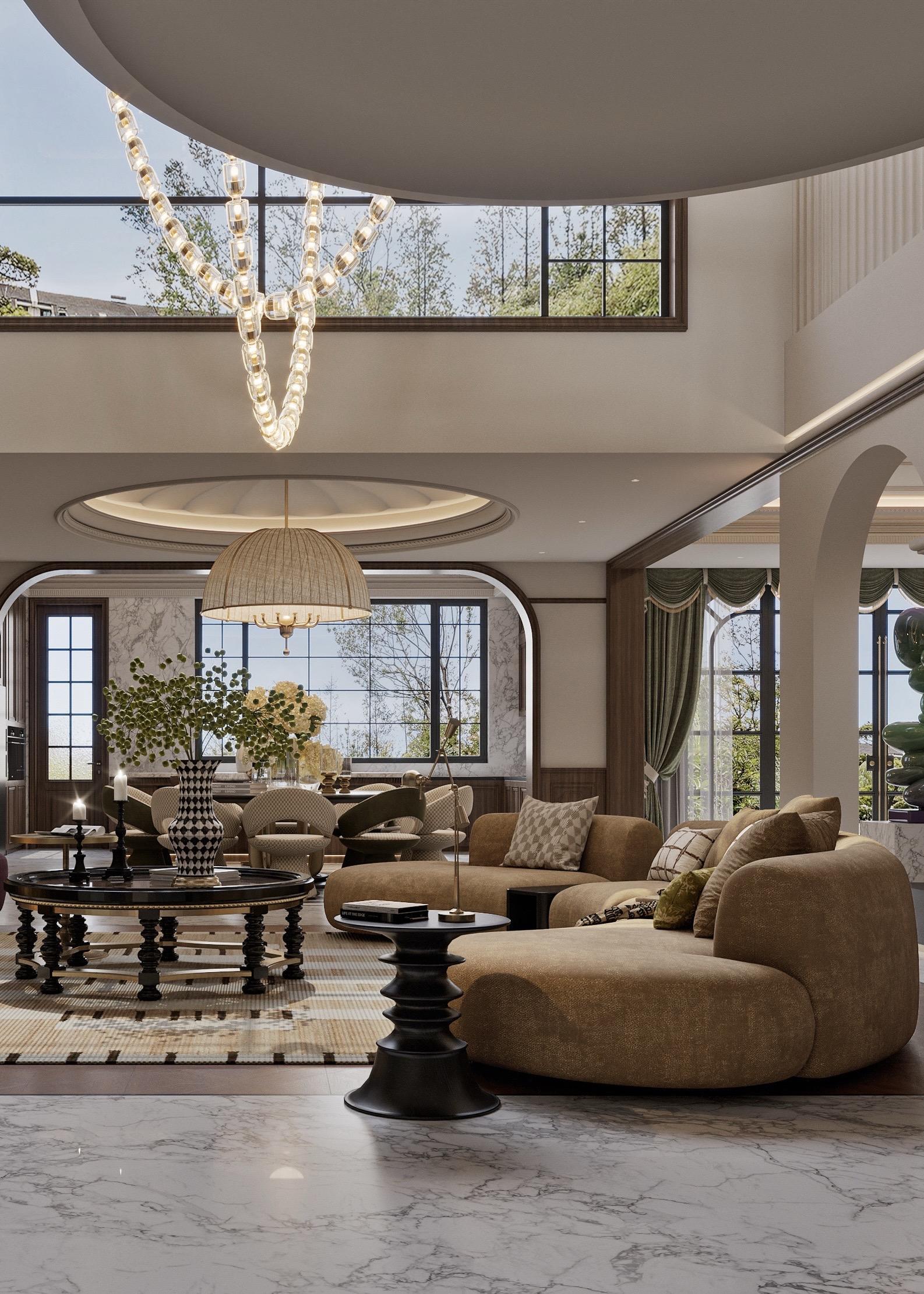 在昆明,家装修成了“老钱风”电影主角的家。下沉式挑空客厅 让整个公共区域拥有了绝佳的层次感和互动性,无论坐在哪都能成为画面的一部分。