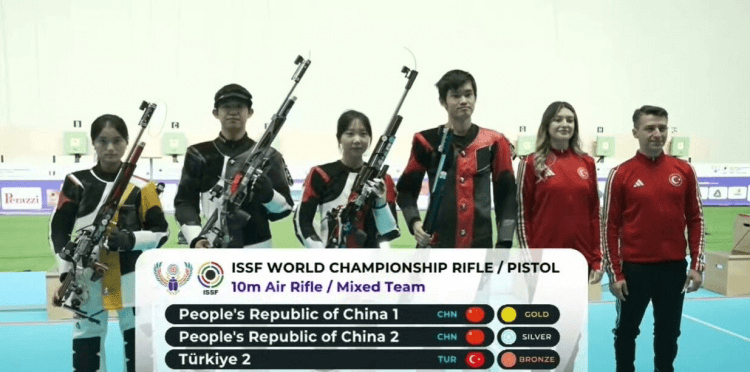 此前,在首日结束的比赛中,盛李豪、王竑昊、王雨桐以1898.4环的总成绩破世界纪录,获得男子10米气步枪团体赛金牌。