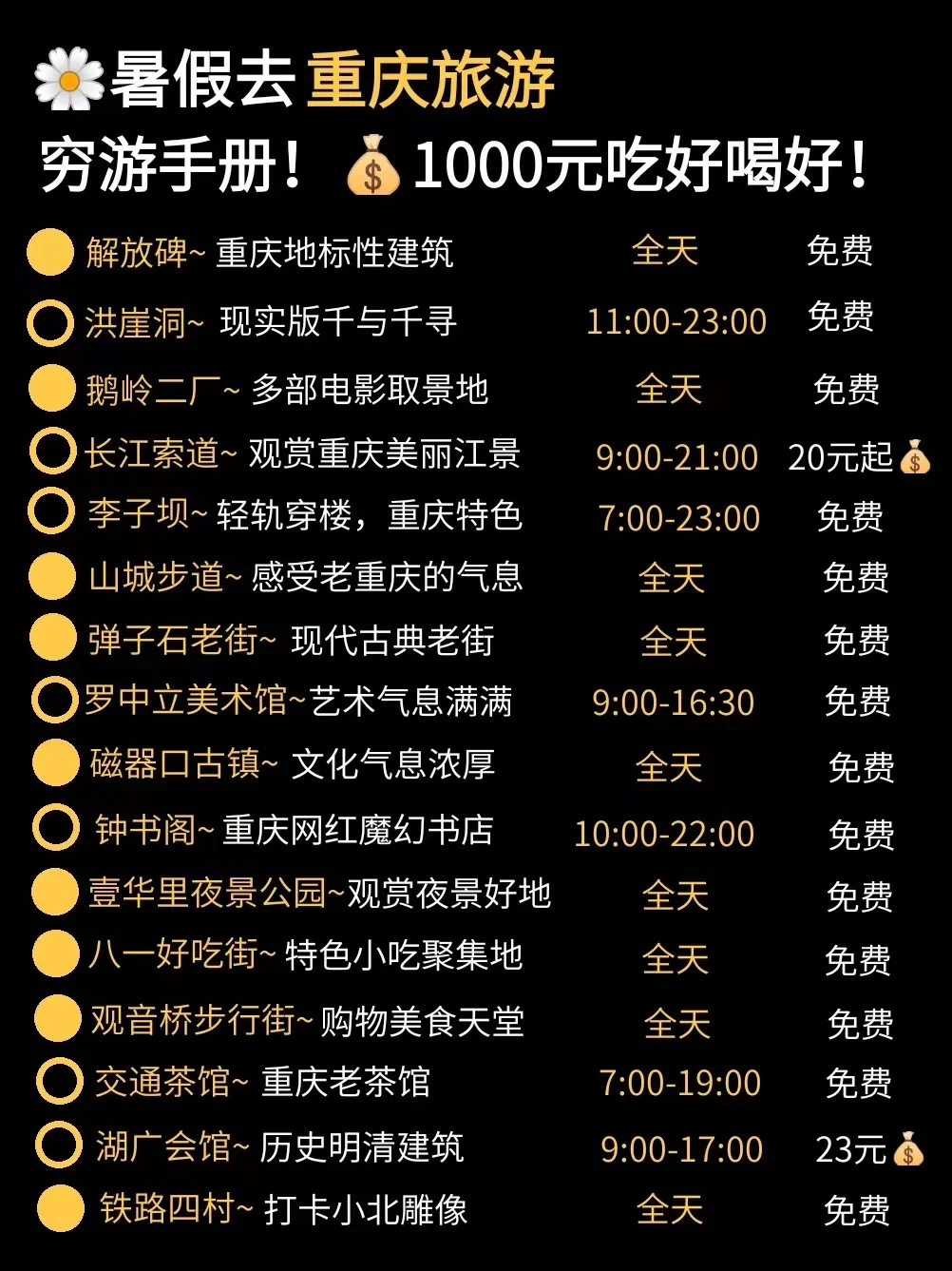重庆真的太适合穷游了,景点🈚️需门票,美食又多。我的这份穷游攻略分享给大家,让你1000元内拿下重庆旅游