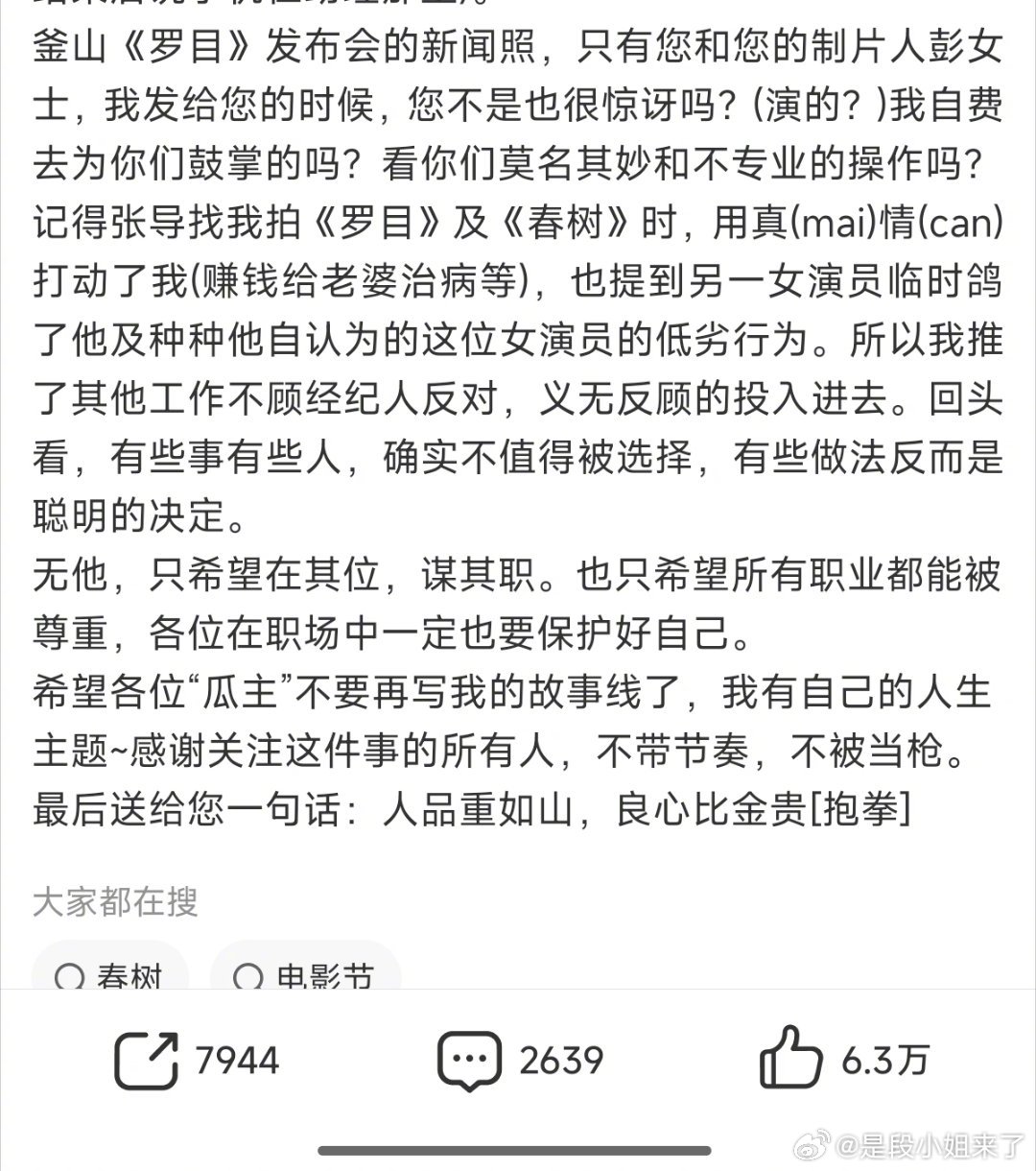 简单来说,导演和制片先邀请她入局拍戏,一起攒局,拍出来两部电影,第一部入围了釜山,结果是让她自费去的现场,找了制片人结果被搪塞;第二部入围东京,结果放完后有消息有奖拿结果不告诉她,还让她提前一个人走了。
