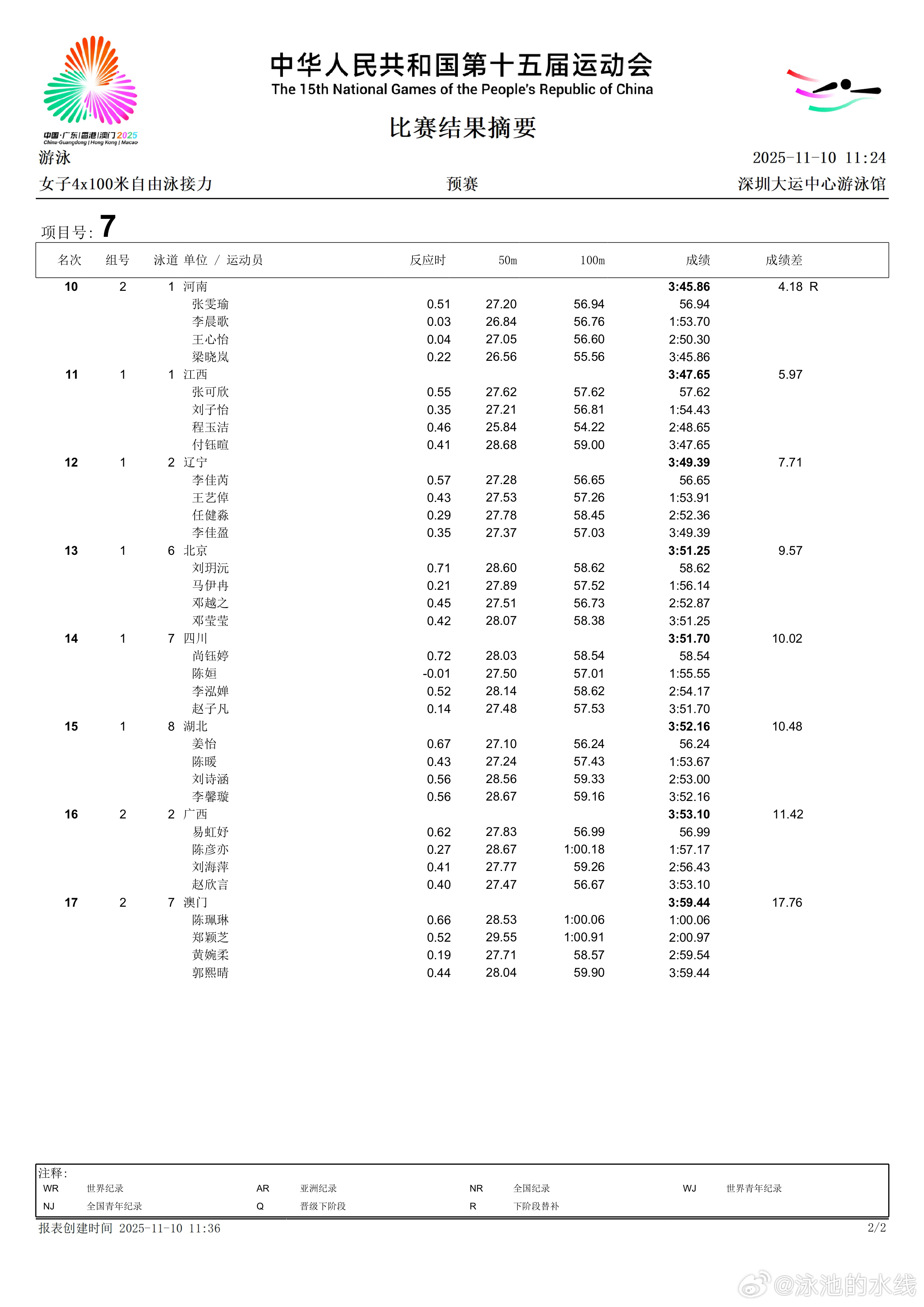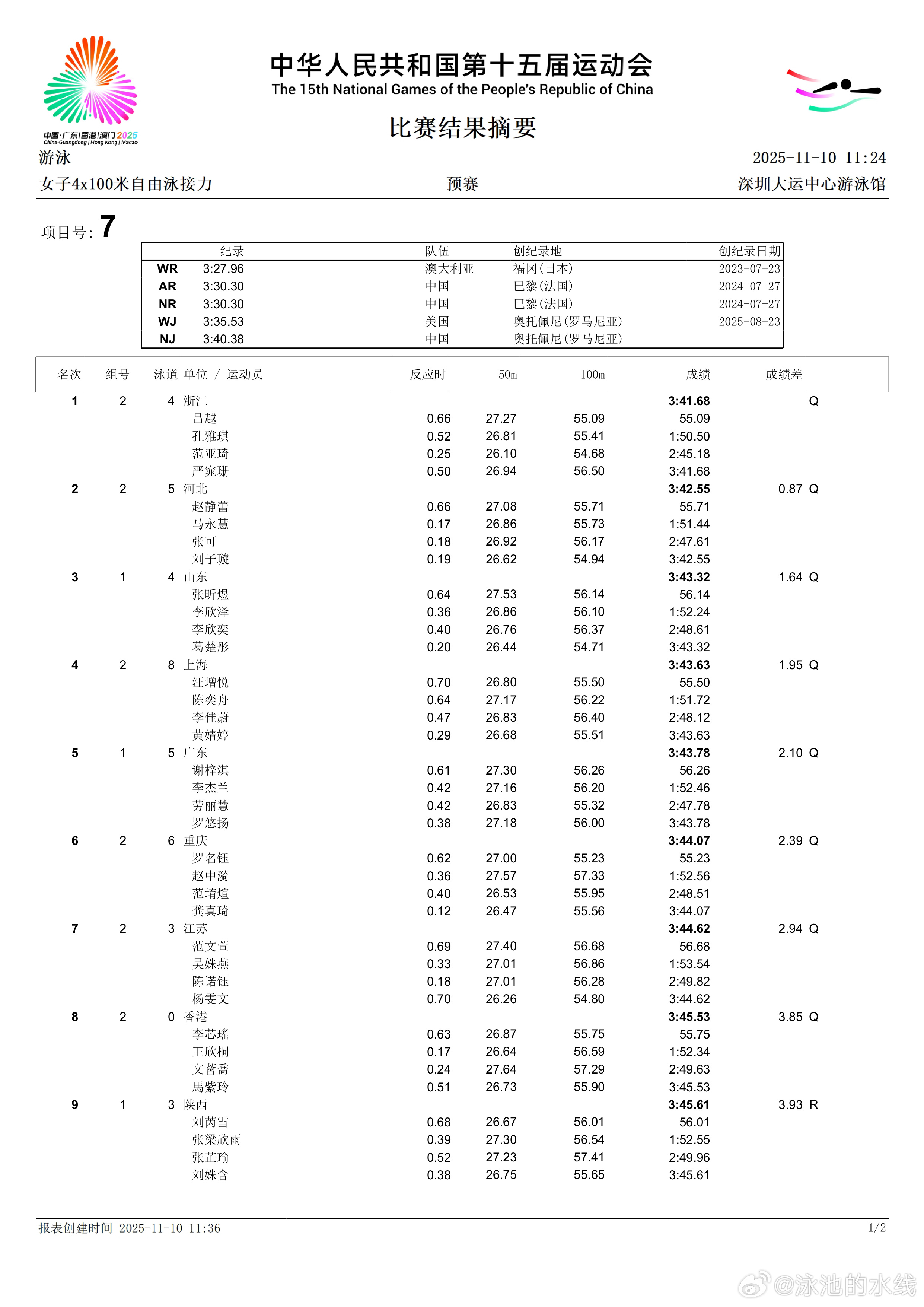 第十五届全国运动会 女子4x100米自由泳接力预赛分段成绩