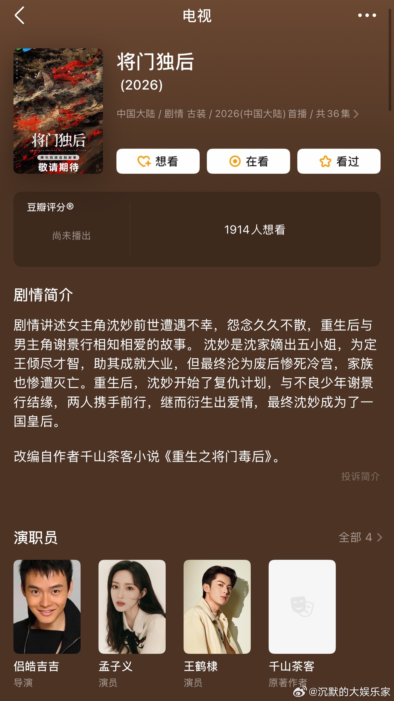 这本小说要影.视.化,原.著.粉心都提到嗓子眼了。书里的沈妙、谢景行人设太绝,选角稍有差池,那就是塌.房现场[笑cry]选沈妙,演技得撑得起她前期扮猪吃虎后期霸气掌.权;找谢景行,颜值得有“这世间,大抵没有比他更出色的人物”的矜贵。求求剧组,好好选角,别毁了大家的白月光啊!!对接确认孟子义演将门毒后孟子义 沈妙