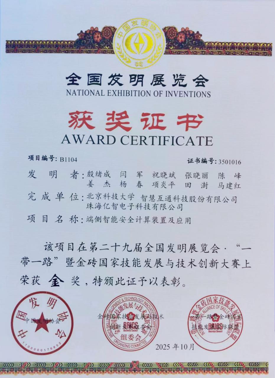 中证报中证网讯(王珞)近日,由中国发明协会主办的第二十九届全国发明展览会与第六届中国国际数字经济博览会同期在河北省石家庄国际会展中心举行。凭借高精度AI+交通前沿技术的创新优势,以及突出的经济效益与社会效益,智慧互通(AICT)联合北京科技大学、珠海亿智电子科技有限公司申报的“端侧智能安全计算装置及应用”项目获得本届展会金奖,受到众多评委及与会嘉宾的认可。