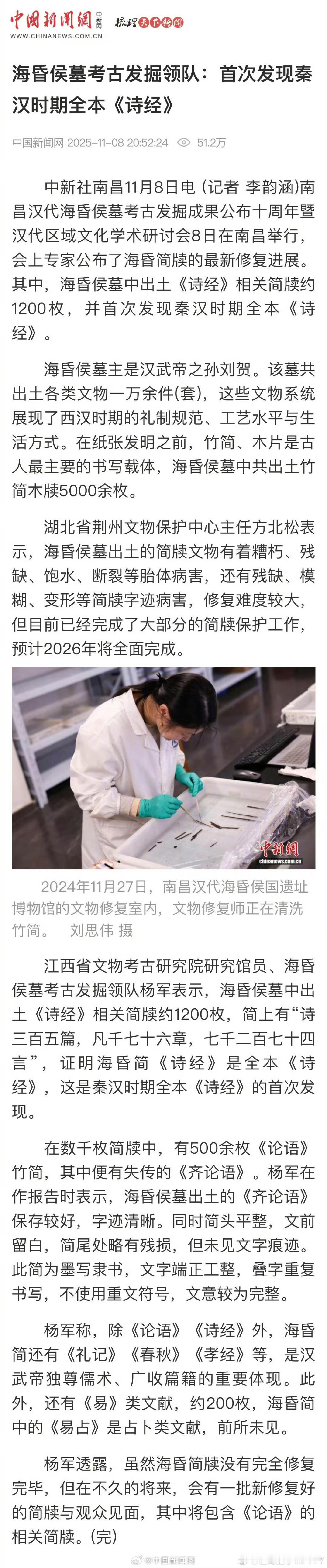其中,海昏侯墓中出土《诗经》相关简牍约1200枚,并首次发现秦汉时期全本《诗经》。