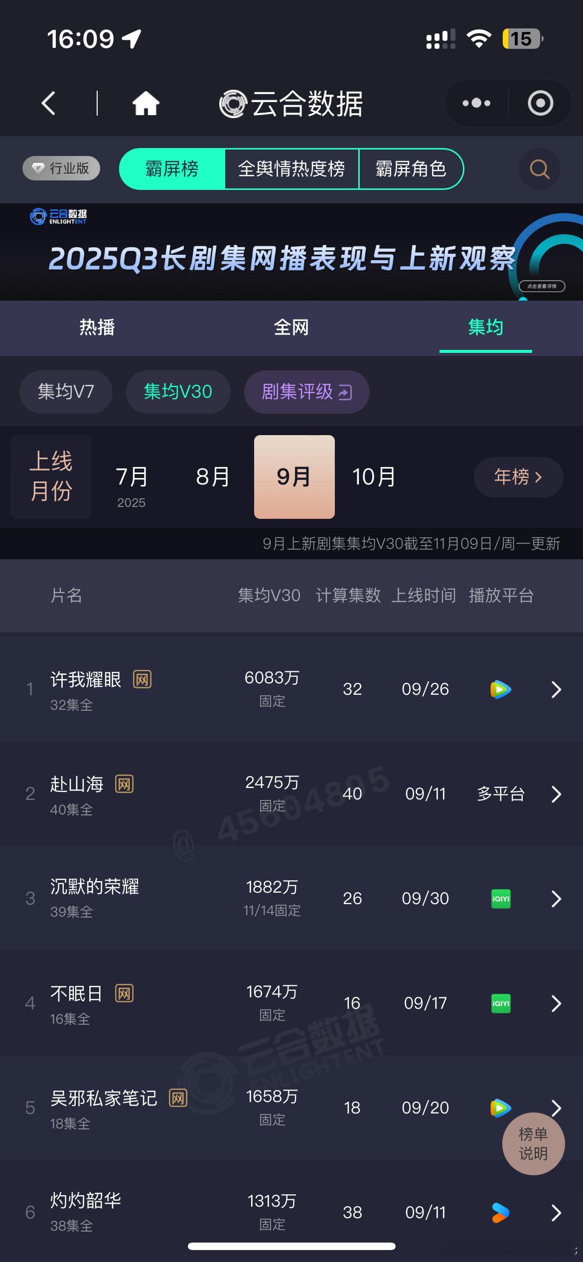 赵露思、陈伟霆许我耀眼 云合热播期集均确值6328万,云合集均V30为6083万