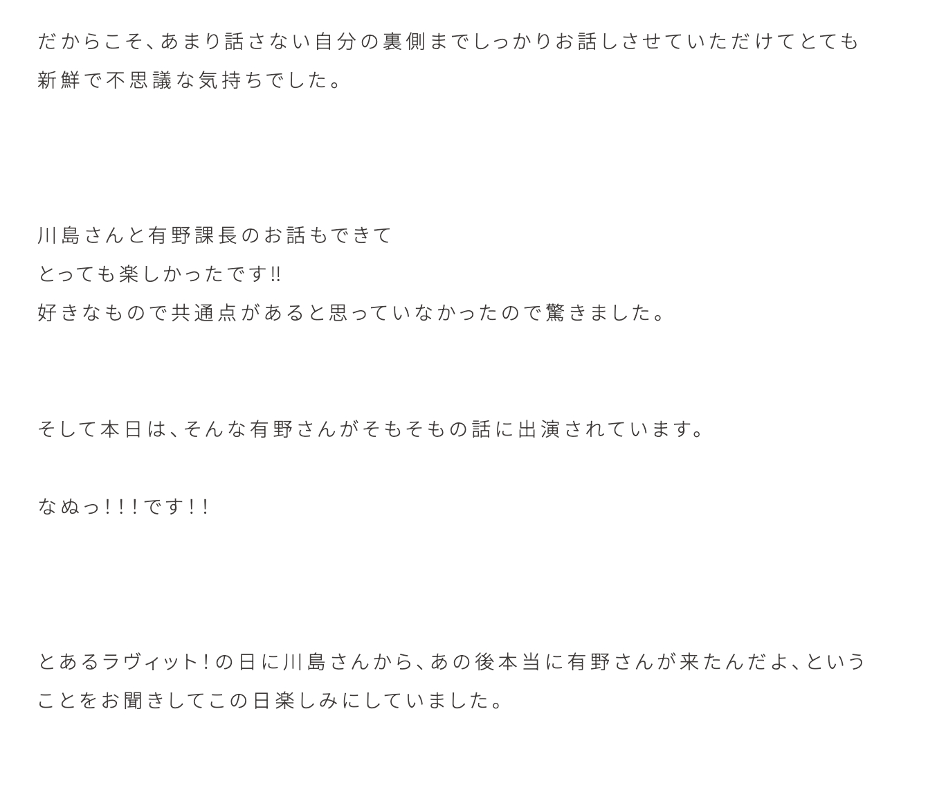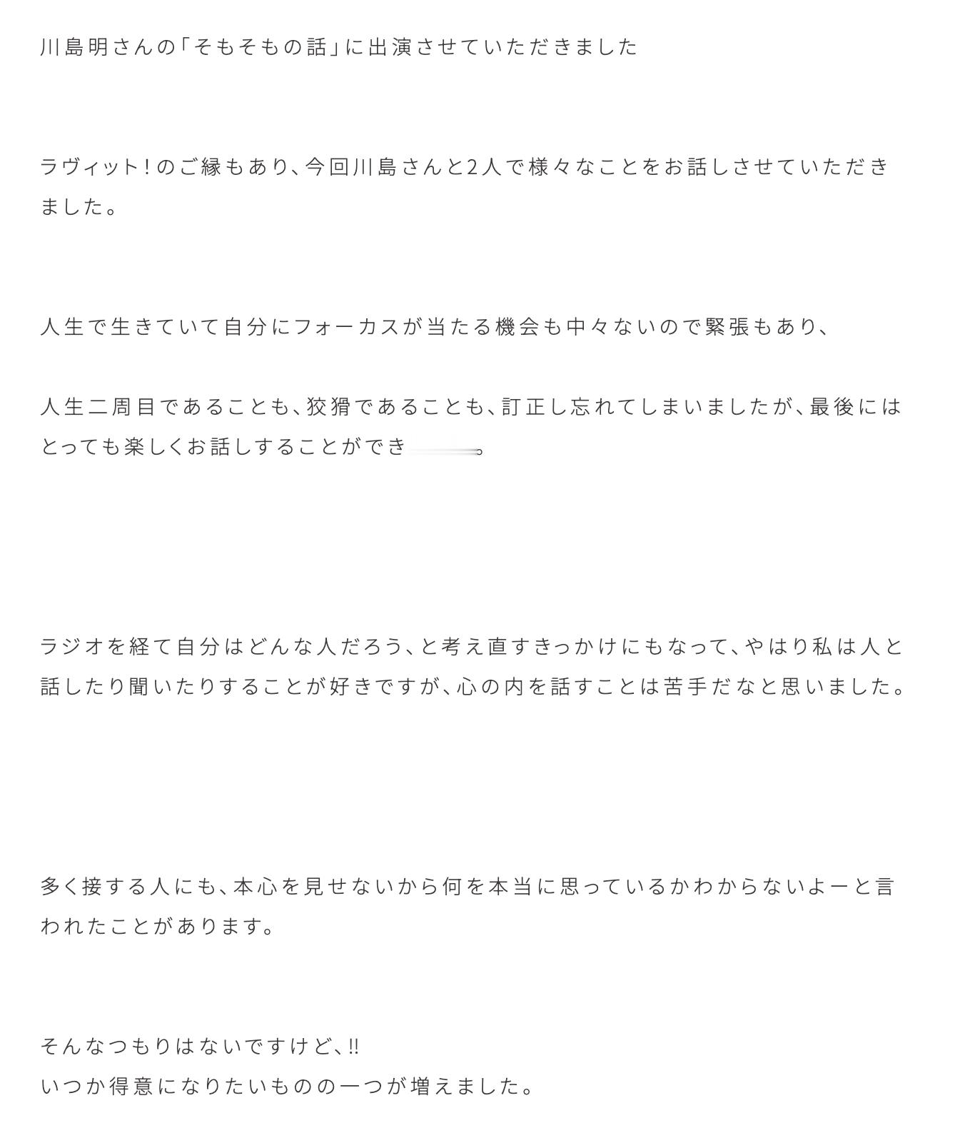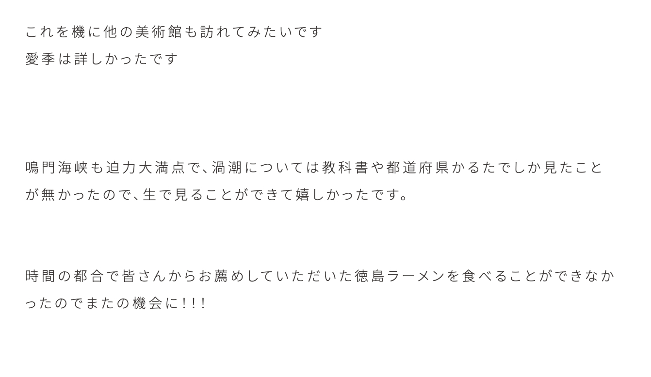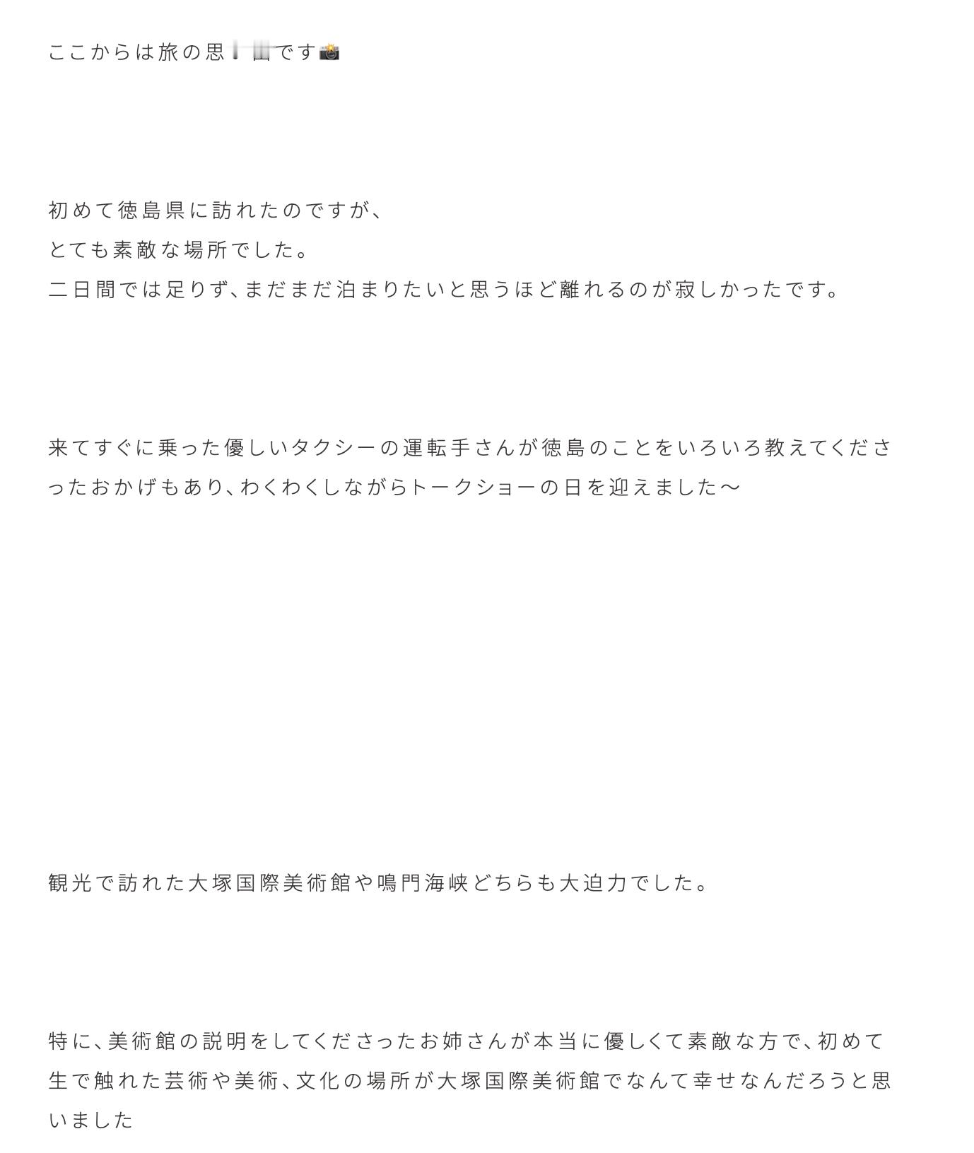 小島凪紗「初めて徳島県に訪れたのですが、とても素敵な場所でした。二日間では足りず、まだまだ泊まりたいと思うほど離れるのが寂しかったです。来てすぐに乗った優しいタクシーの運転手さんが徳島のことをいろいろ教えてくださったおかげもあり、わくわくしながらトークショーの日を迎えました〜。」