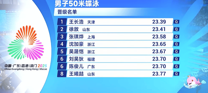 全运会男子50米蝶泳半决赛:王长浩头名晋级,徐放刷新PB