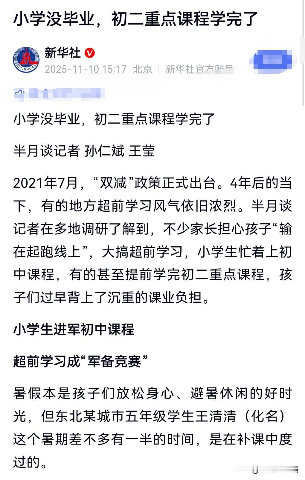 这也太丧心病狂了吧,这么卷的吗? 这真的是太离谱了,11月10日我在网上看到一个热搜。 小学没毕业,初二重点课程学完了。 这也太拔苗助长了吧,小学都没毕业,竟然把初二重点课程学完了。 暑假的校外培训实在是太荒唐了。 这样的学习压力真的是太大了。 不是所有的学生都会感到热爱的。