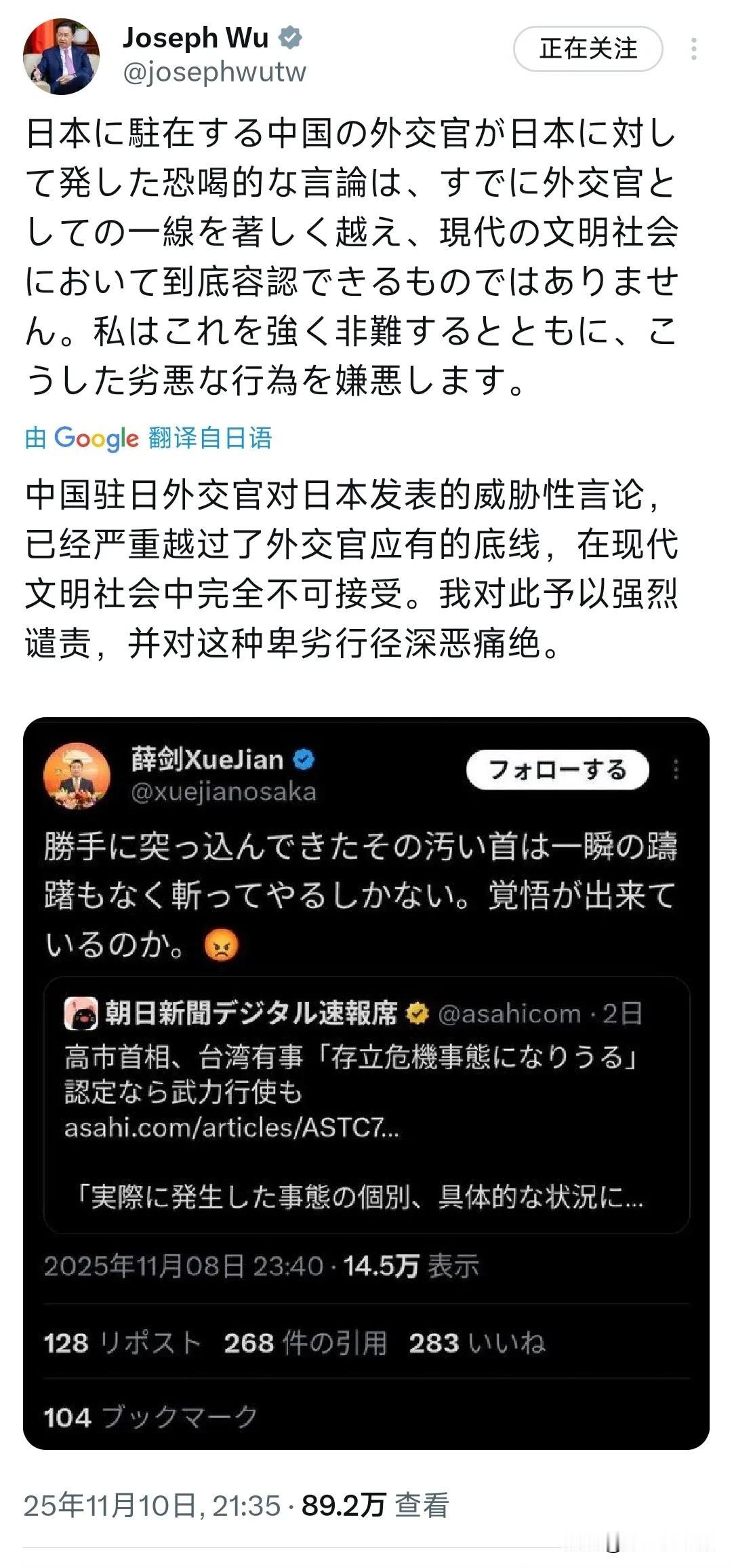 台湾安全会议秘书长吴钊燮昨晚(11月10日晚)叫嚣道:“中国驻日外交官对日本发表的威胁性言论,已经严重越过了外交官应有的底线,在现代文明社会中完全不可接受。我对此予以强烈谴责,并对这种卑劣行径深恶痛绝。” 评几句 吴钊燮的言论是民进党当局“媚日卖台”的又一铁证。日本政客公然践踏中国红线,我外交官严正交涉天经地义,却被岛内“台独”分子污蔑为“越界”,这不是睁眼说瞎话是什么?民进党当局为抱日本大腿,连民族尊严都能塞进贡箱,把台湾百姓当讨好外人的筹码,这种数典忘祖的丑态,只会把台湾推向更危险的深渊。历史早就证明,挟洋自重终是饮鸩止渴,任何背叛民族的败类,终将被钉在耻辱柱上!