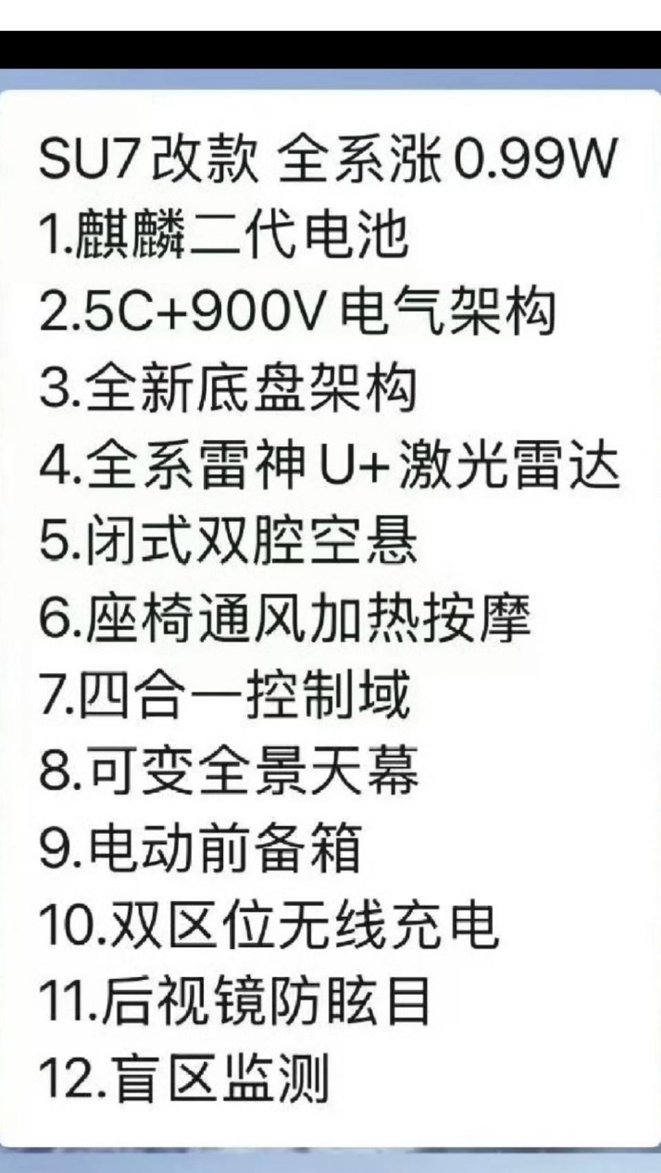小米SU7改款给友友们带来啥福利 近期友友们谈论较多的小米SU7改款了,预计涨价一万多。小米SU7样式确实让人心动,现在改款后给友友带来更多福利了。据说有友友可以提前提车了,成为首批改款后车主,有的友友订的YU7预计几十周才能提车。 友友们对改款后小米SU7有什么期待?
