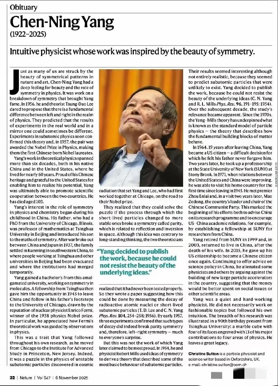 朋友问我杨振宁到底有什么杰出成就? 那这个可有得说了! 杨振宁是个研究粒子的科学家,他有个理论叫杨-米尔斯规范场论。这个理论听着复杂,但实际是现在研究微观世界的基石,靠着这个理论,有十多个科学家拿了诺贝尔奖。 他和邓稼先是好朋友,俩人从小就一块读书,后来一个搞原子弹,一个研究基础物理。邓稼先回国后直接参与两弹,杨振宁留在美国继续做研究,后来又回中国教书。两种选择都是当时国家最需要的。 杨振宁在清华教基础物理,八十岁还在给学生上课。他说过"宁拙毋巧",就是让别人都踏踏实实做学问。他办公室挂着副对联"仰观宇宙之大,俯察粒子之微",就是他做科研的态度。 晚年他帮中国引进了计算机专家姚期智,密码学家王小云。在他百岁生日时,他告诉邓稼先的家人,自己这几十年没辜负老朋友的期望。 去世前他还参与讨论要不要造大对撞机,认为科研要结合国家实际。留下的不只是理论,还有培养人才的学校。