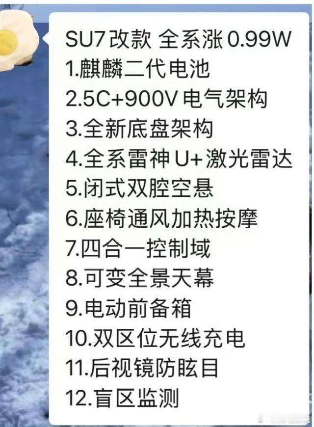 不过就和SU7 YU7发布之日各个媒体帮忙抬轿子一样的道理,这个的SU7改款,升级是肯定有的,价格不一定真的涨,即便涨价,增配的东西也会远远超过1万。
