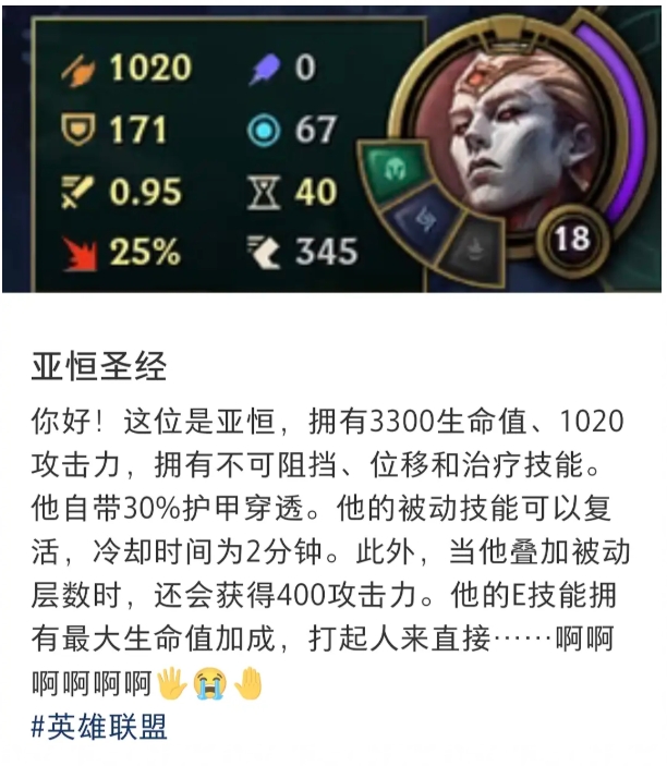 直播吧11月11日讯近日,英雄联盟公布了新英雄亚恒,而不少玩家也测试服进行体验,然而今日有玩家发现新英雄的机制和数值强的可怕!