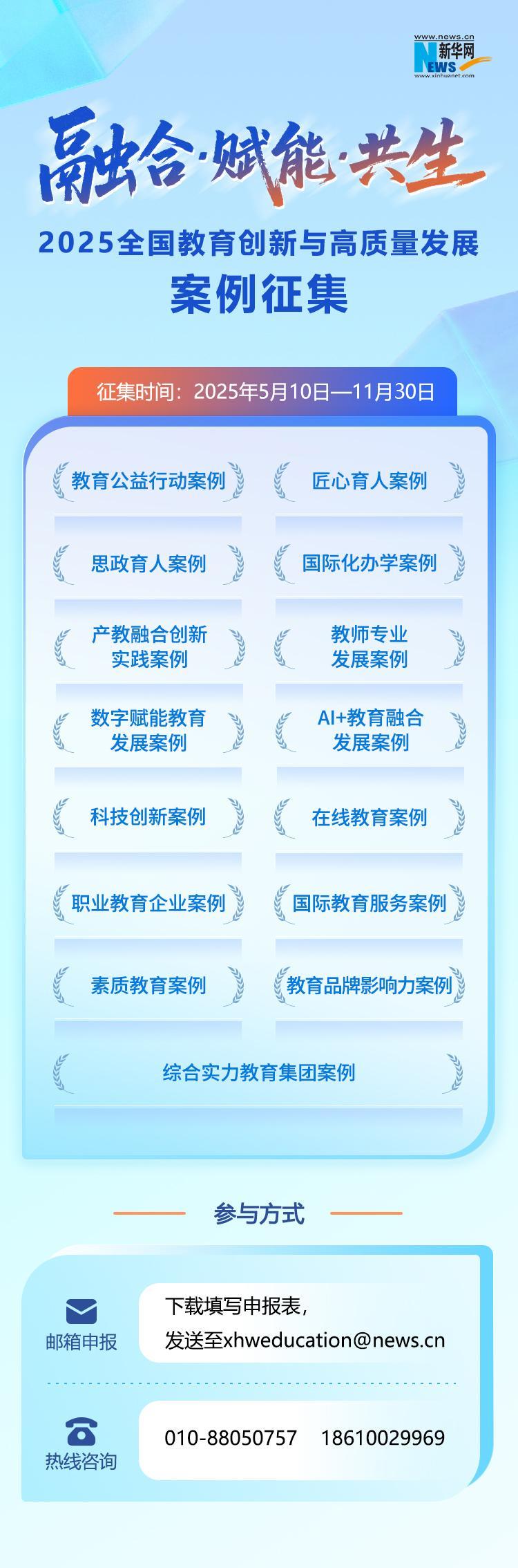 为充分展现“十四五”以来中国教育改革的基层创新活力与实践成果,依托过往案例征集活动的成功经验,新华网推出“2025全国教育创新与高质量发展案例征集活动”。本次征集活动紧扣“十四五”教育改革核心方向,覆盖思政育人、数字赋能教育、产教融合、国际教育等15大类实践领域,全面呈现各级各类教育领域的创新探索与典型经验。