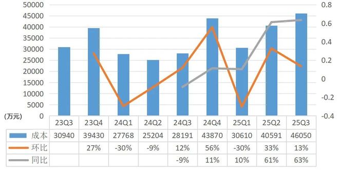 禾赛科技2025年第三季营业成本为4.61亿元(6470万美元),较2024年同期的2.82亿元增加63.3%。
