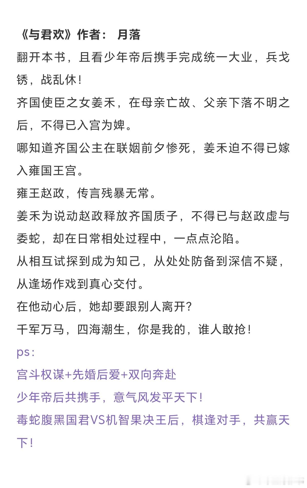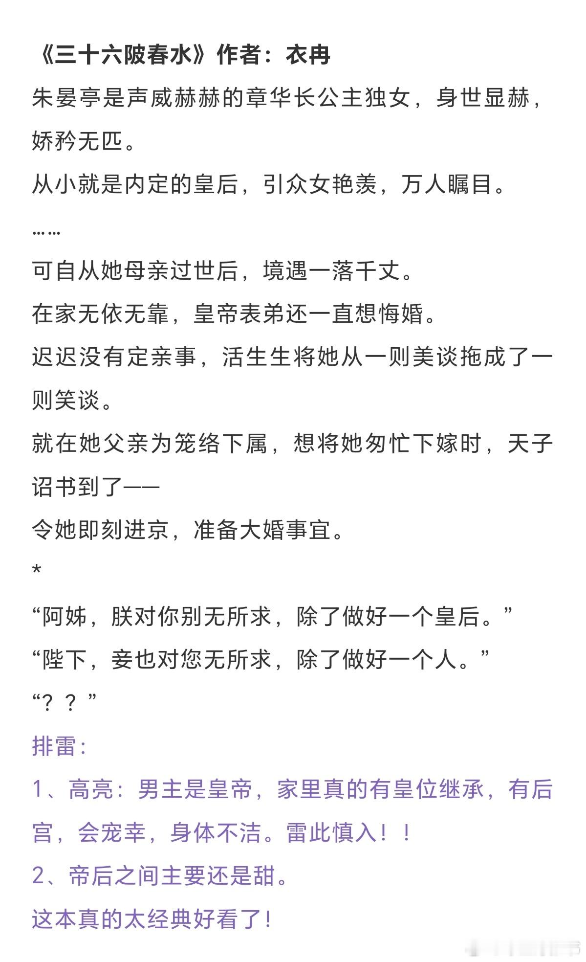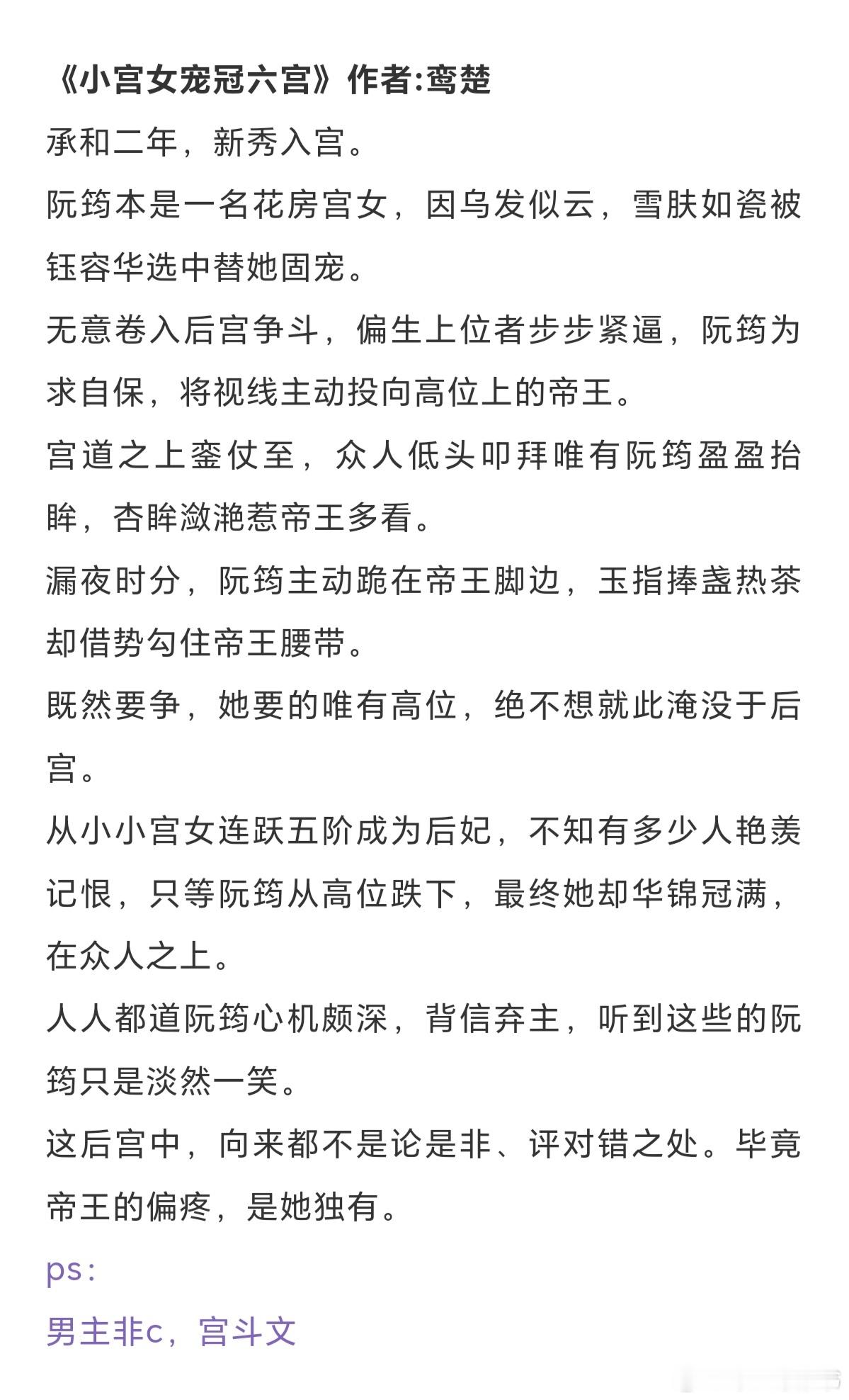 帝后文合集:这后宫中,向来都不是论是非、评对错之处。毕竟帝王的偏疼,是她独有。《娘娘她宠眷不衰》作者:茸兔《小宫女宠冠六宫》作者:鸾楚《天香》作者:梦溪石《嫁千户》作者:白鹿谓霜《雪满长空》作者:求之不得《与君欢》作者: 月落 《三十六陂春水》作者:衣冉《冷殿春暖》作者:凉虾戏冰粉 《卿心似玉》作者:乔燕