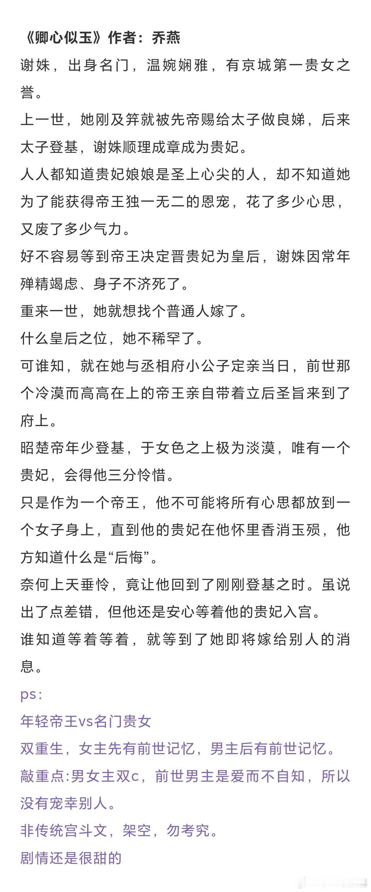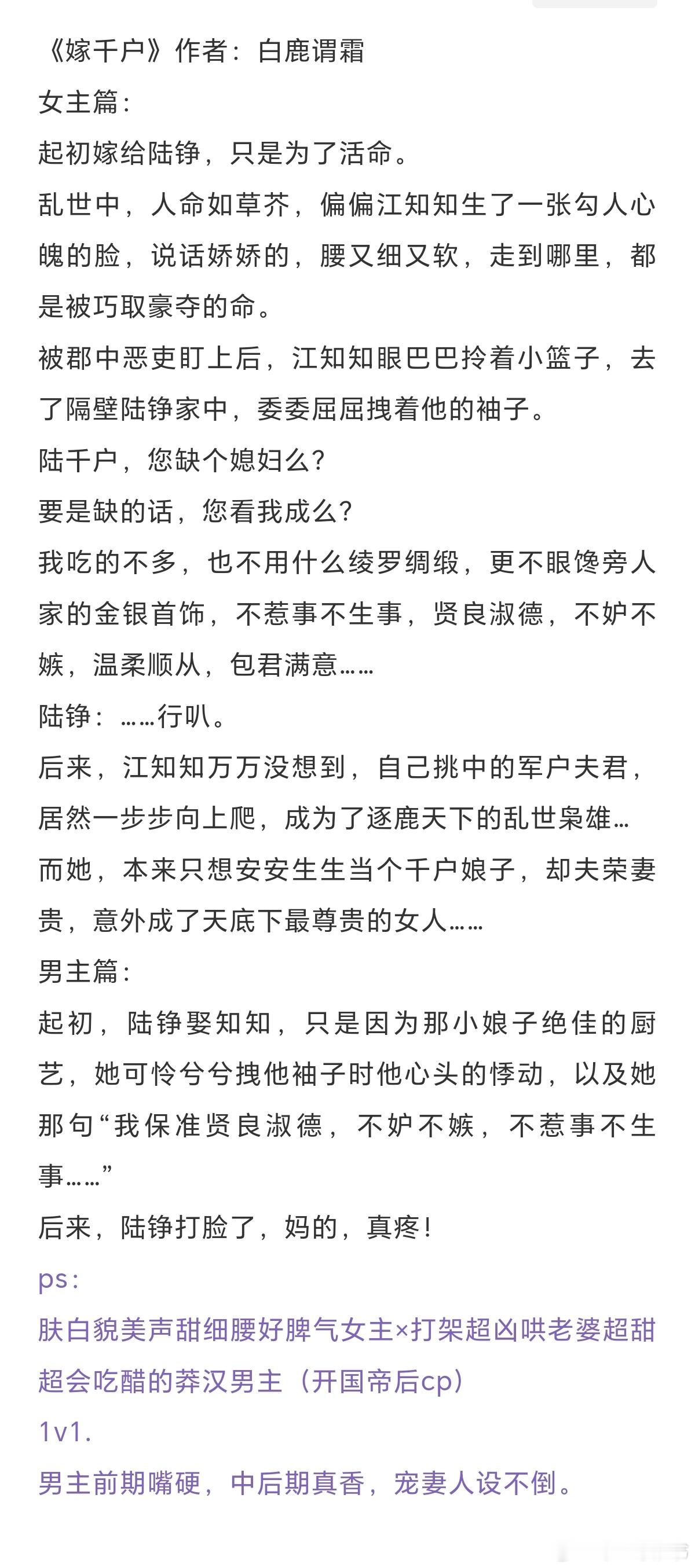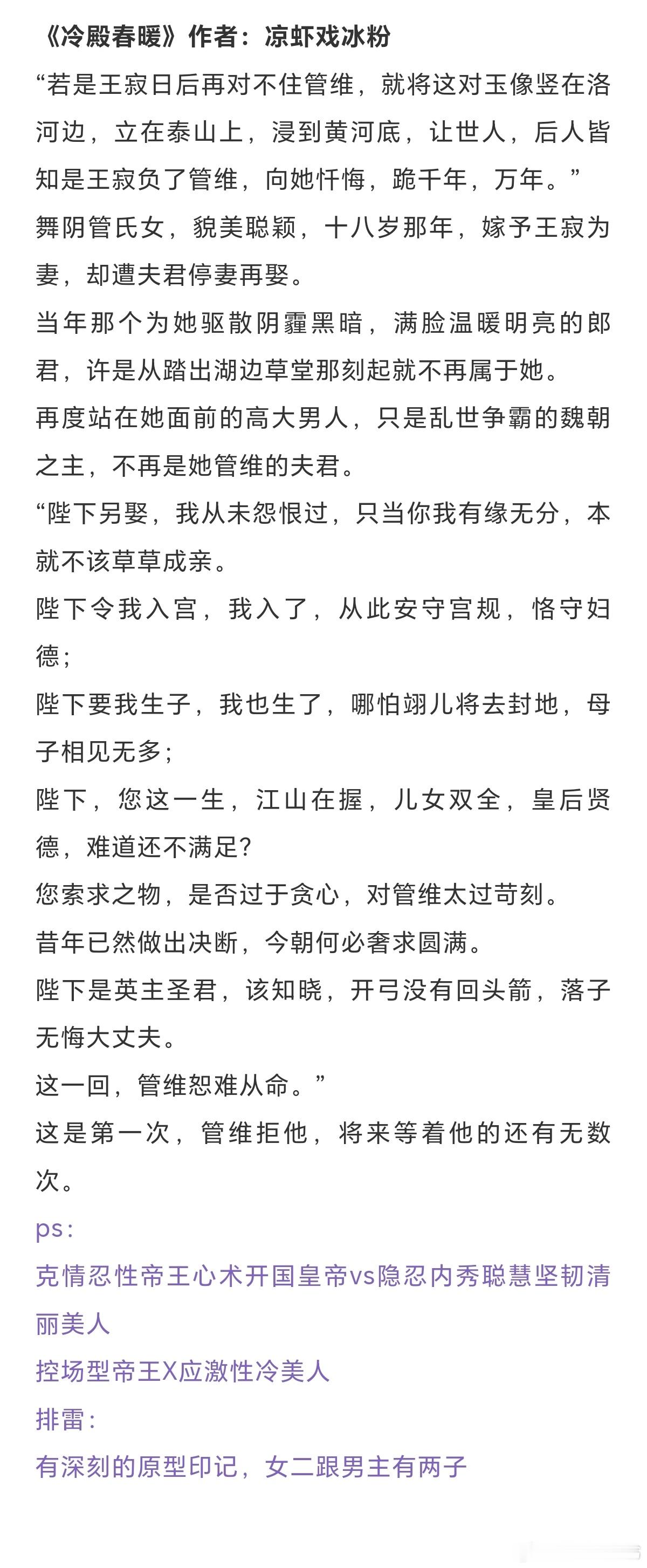 帝后文合集:这后宫中,向来都不是论是非、评对错之处。毕竟帝王的偏疼,是她独有。《娘娘她宠眷不衰》作者:茸兔《小宫女宠冠六宫》作者:鸾楚《天香》作者:梦溪石《嫁千户》作者:白鹿谓霜《雪满长空》作者:求之不得《与君欢》作者: 月落 《三十六陂春水》作者:衣冉《冷殿春暖》作者:凉虾戏冰粉 《卿心似玉》作者:乔燕