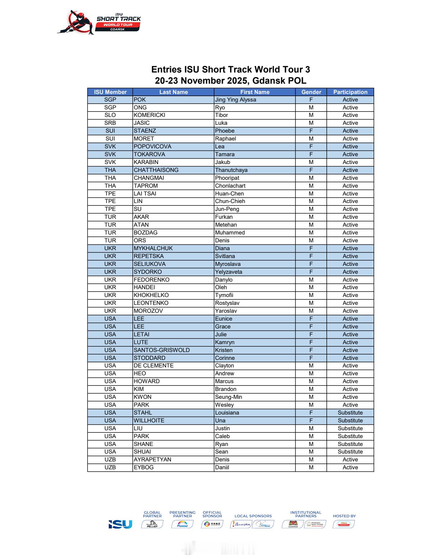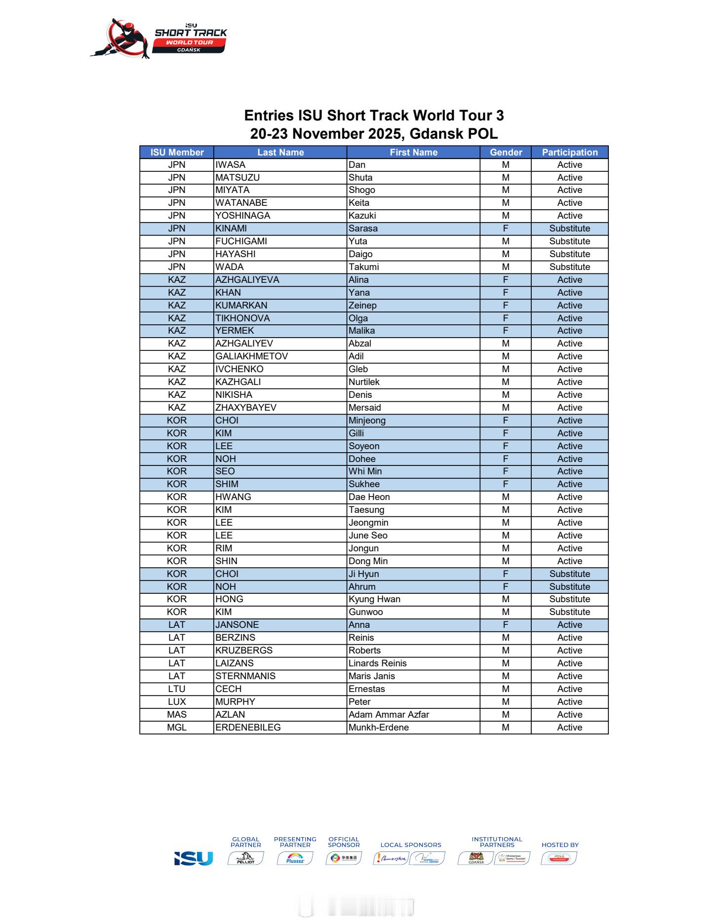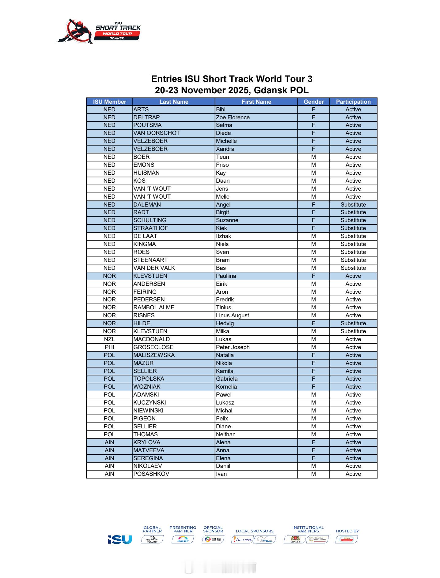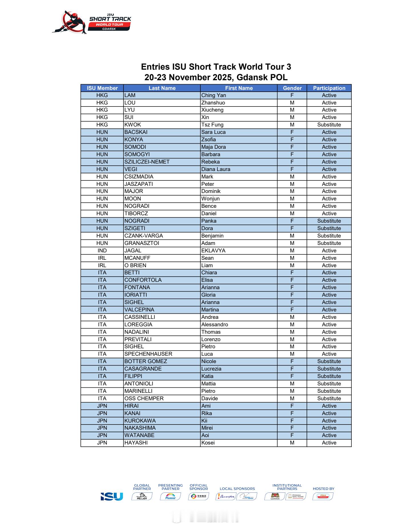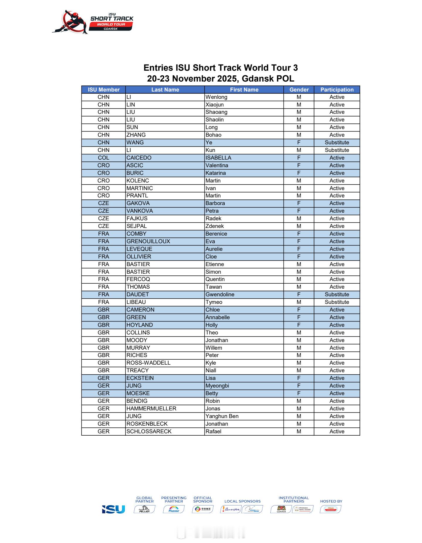 25-26赛季短道速滑世巡赛波兰站(第三站)中国队参赛名单🇨🇳男队:李文龙 林孝埈 刘少昂 刘少林 孙龙 张柏浩 李坤(替补)女队:范可新 公俐 王欣然 杨婧茹 臧一泽 张楚桐 王晔(替补) 🇨🇳加油!!!