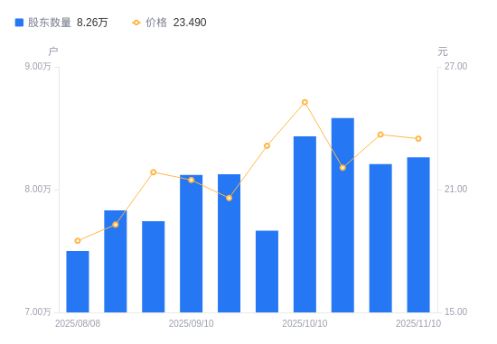 近一年(2024年11月20日至2025年11月10日),锡业股份A股股东户数从8.7万户,减低至8.26万户,降幅4.96%,区间股价上涨58.29%。