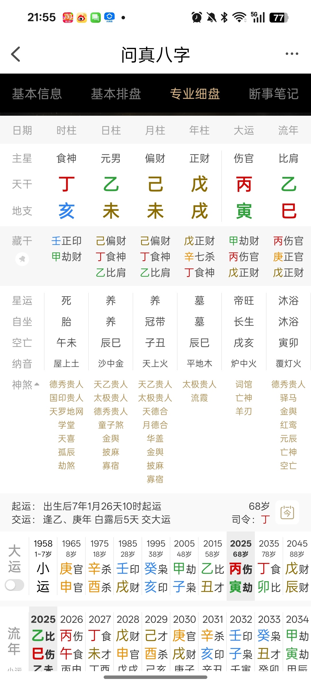 🕶:戊戌 己未 乙未财星的力量极其强大。乙木日主身弱不胜财,面对满盘的财星,其人生核心就是去管理、控制——他渴望控制巨大的资源来完成他的艺术表达,但先天的能量又不足以轻松驾驭,必须靠运帮扶,之前走的水木运风生水起,公司名字也是水木。但是又很容易担不住,所以过去很多投资给他都是亏的。高成本制作,投他的公司濒临破产。走水运发展好,说明不是从弱,身弱喜水木。如果真从弱了,喜用神应该是火土金,忌水木帮扶。因为前三柱没有印,所以他不善于教说、给下属理论、讲概念、技术框架,而是依赖于对现场场景、演员的直觉性调动和感觉捕捉。我感觉他更像丁亥时。追求有文艺情调,时干丁火食神有那种细腻的感受力、文艺情调,夜间之火亮起来,光影愠氤(好像是这样,忘记这个字怎么写了),比较善于暧昧、擅长塑造氛围感。而且他很在意印,非常在意场面、样子。有型。他小的时候,外公 虽是普通人家出身,却有着对生活的精致追求,而母亲沿袭了这份讲究,即便在家也总穿着合体的旗袍,梳着整齐的发髻。家里父母会带他去西餐厅用刀叉;母亲性格文雅精致。童年常带🕶看电影,深刻影响了他的电影创作和美学风格;他内心有对印的强烈需求和行为外化,必须让自己置身于一个有型、有格调的环境中。他第一第二部运,非常克手足同胞。早年因外部限制,哥哥姐姐留沪,母亲与他相依为命,常因为思念孩子思念落泪。父亲一直在外,常驻马来西亚,母子二人在港相依为命。也是印星对他起强烈的作用。辛酉大运,他当编剧,人生最累的运,拿微薄的工资,熬夜干很重的苛刻活。作为新人,只能跟着打打下手。辛酉大运辛酉流年,1981年,老板黄百鸣给他三个月时间写剧本,结果他闭门造车许久,交上来的初稿却被批得一无是处。 被当众羞辱。后来施南生也说,他领了两个月工资,却几乎没去过公司,更没交出过成型的东西。后期换个公司,日子并没有好过多少,甚至被卷入隐形的欺负。他的食印承载的艺术理想,型格体现,受外界的财星压迫,当时很难实现。其实,那些年当编剧「被欺负」的委屈,和被无视,不被尊重的滋味,他应该是最清楚的,他切身品尝过作为底层创作者尊严被践踏的滋味,体会过那种感觉有多难受。所以才转做导演。然而多年后他很轻松的说“现在编剧待遇好多了,以前都不给钱”。曾经身弱、早年被七杀肆意苛待的乙木,在经过水运滋养成长自身变得强大后,居高临下,成为了一个更冷酷的上位者,让下属彼此倾轧。