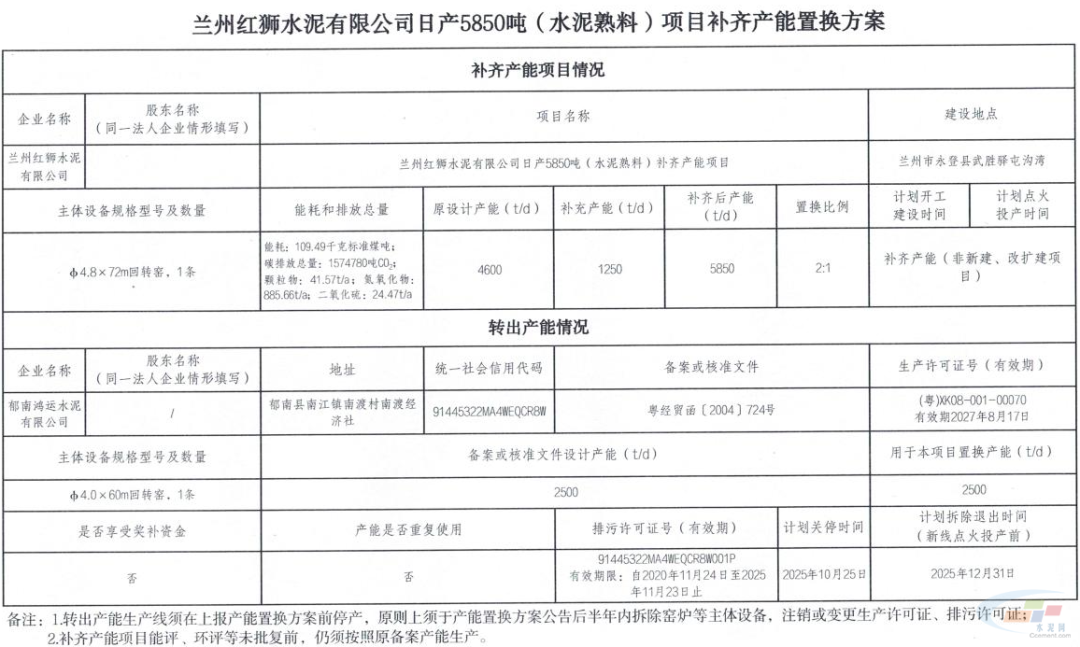 兰州红狮水泥有限公司4600t/d熟料线补充1250t/d产能,置换比例2:1,产能指标来源为郁南鸿运水泥有限公司2500t/d熟料线,用于本项目产能为2500t/d。