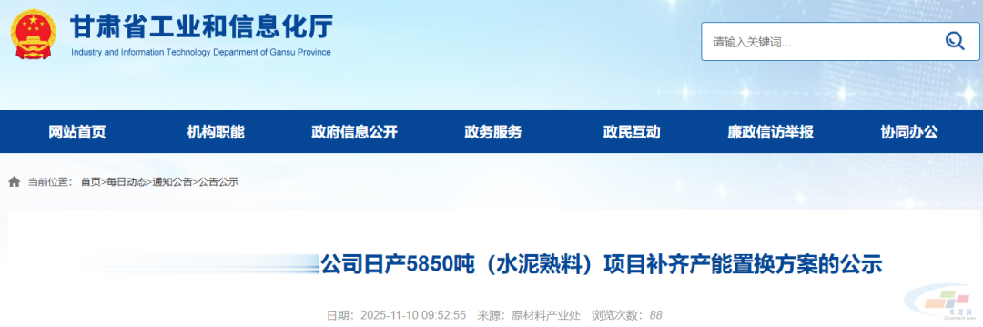 11月10日,甘肃省工信厅发布关于兰州红狮水泥有限公司日产5850吨(水泥熟料)项目补齐产能置换方案的公示,公示时间为2025年11月10日至11月21日(10个工作日)。